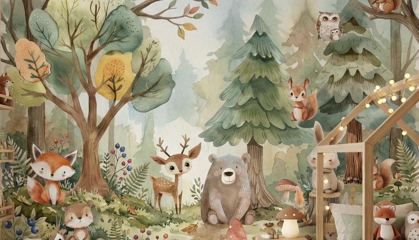 Fototapeta dla dzieci Tapeta las leśna zwierzęta leśne drzewa miś sarna wilk na wymiar FZL10