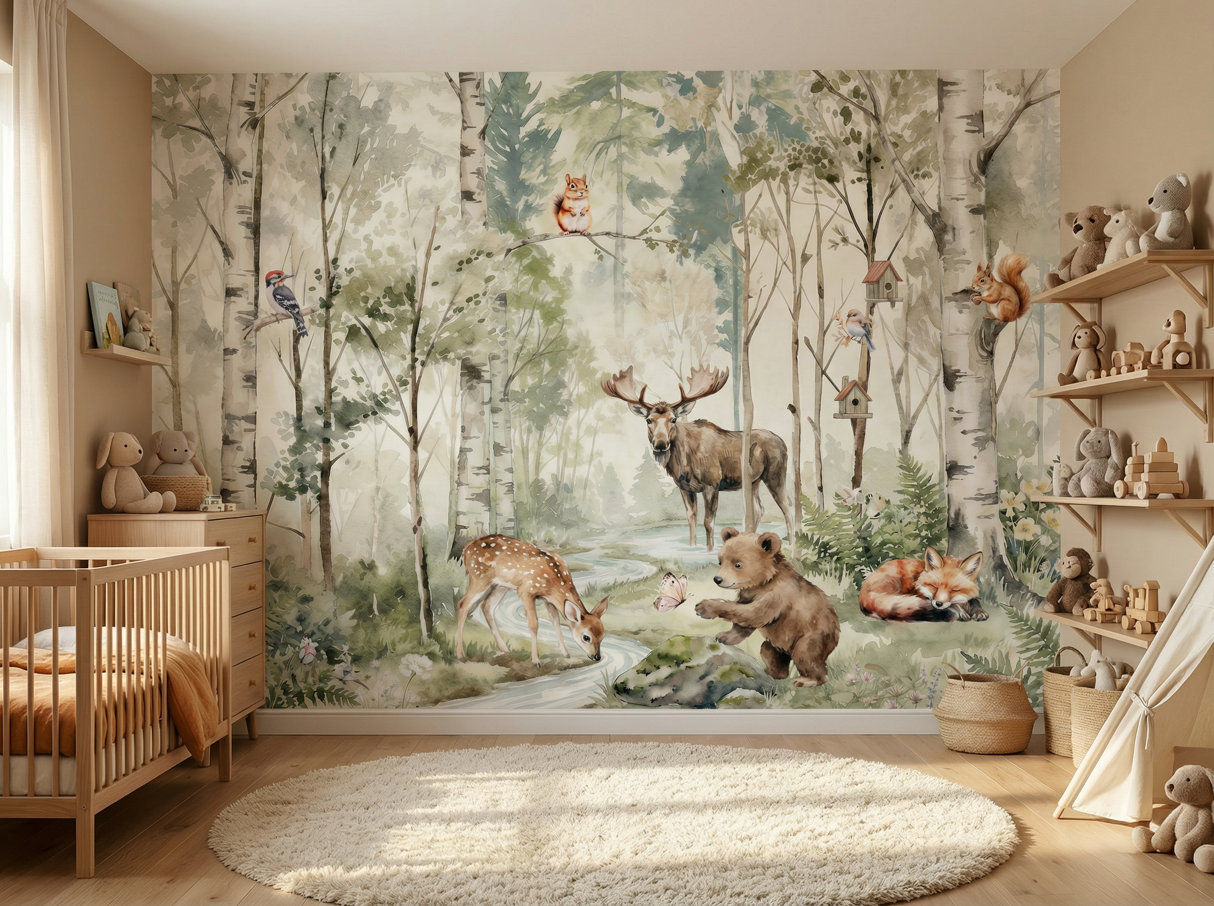 Fototapeta dla dzieci Tapeta las leśna zwierzęta leśne drzewa miś sarna wilk na wymiar FZL55