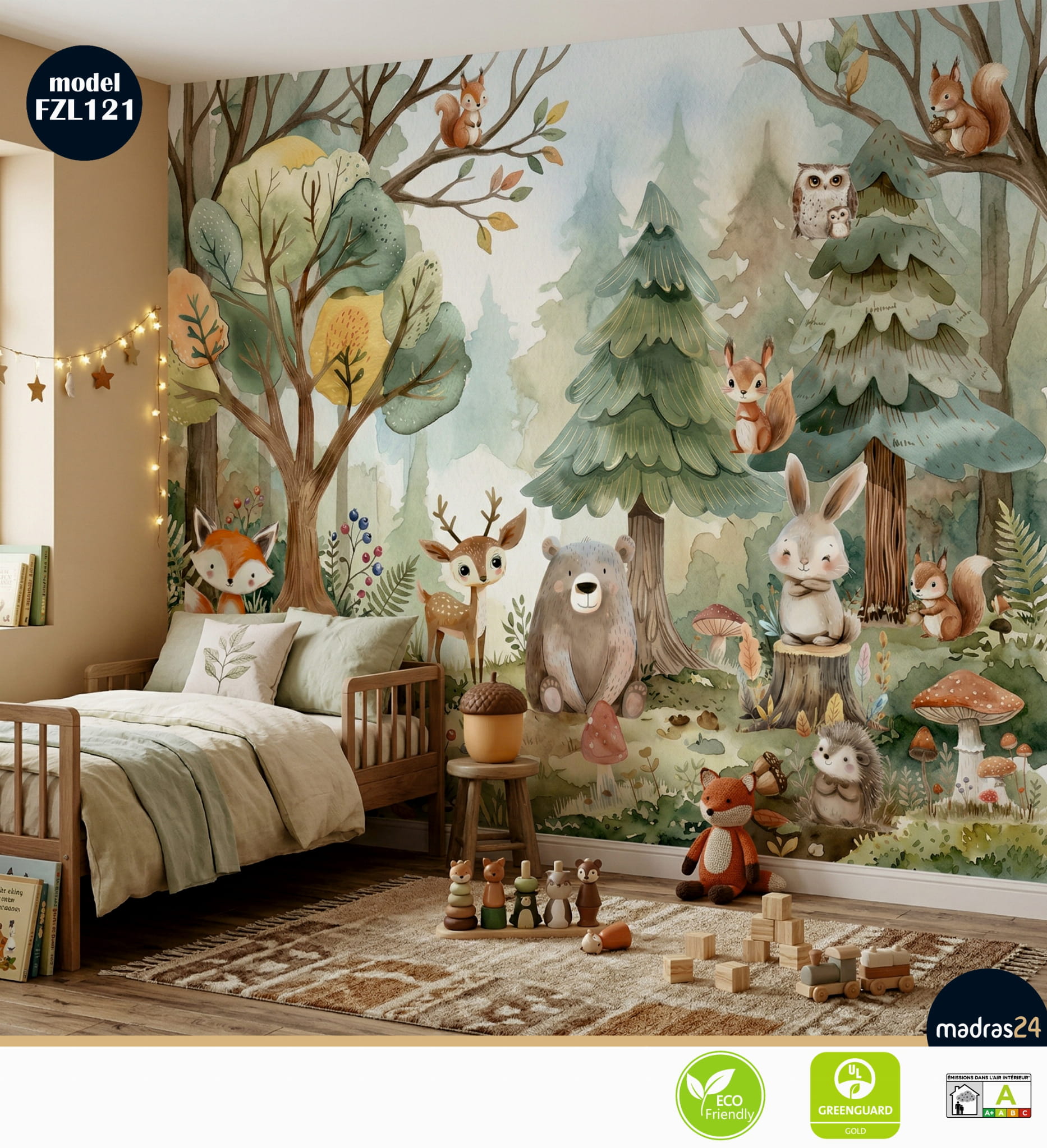 - Kojąca Kolorystyka: Stonowane zielenie, brązy i błękity działają uspokajająco, tworząc idealne warunki do snu i zabawy.