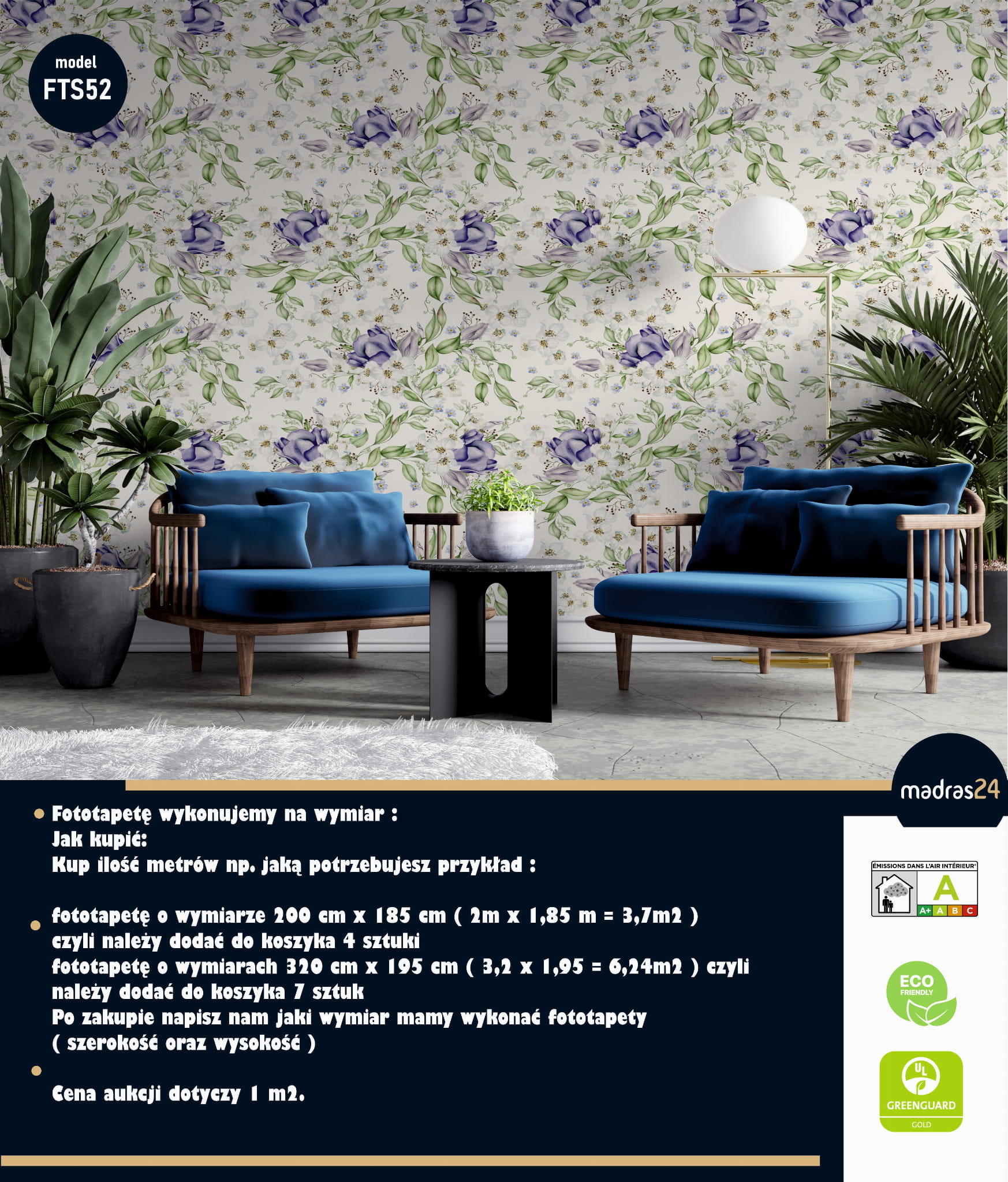 fototapetę o wymiarze 200 cm x 185 cm ( 2m x 1,85 m = 3,7m2 ) czyli w okienku „Kup teraz „wpisujemy ilość 4 sztuki. Po zakupie napisz nam jaki wymiar mamy wykonać fototapety ( szerokość oraz wysokość )
