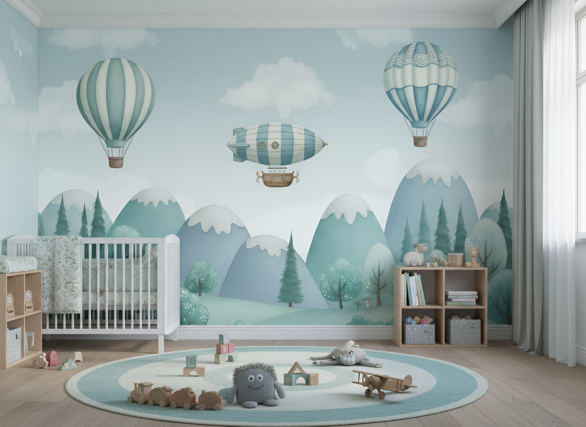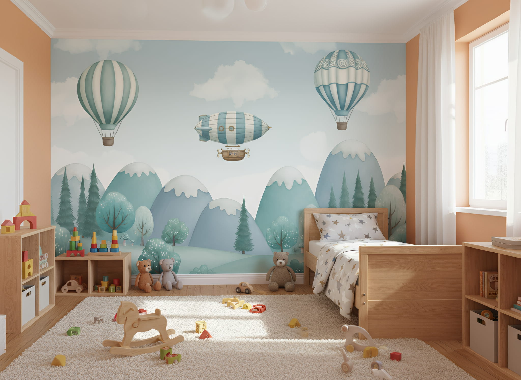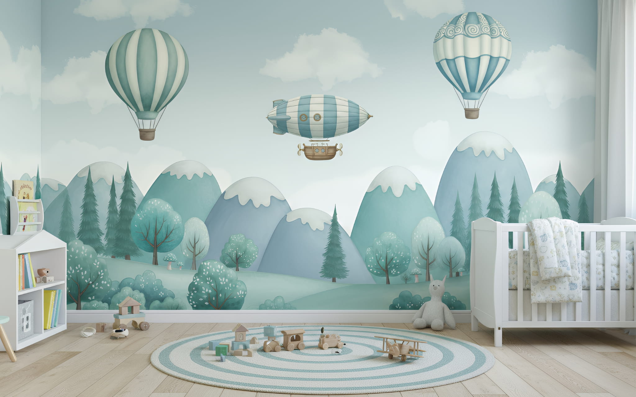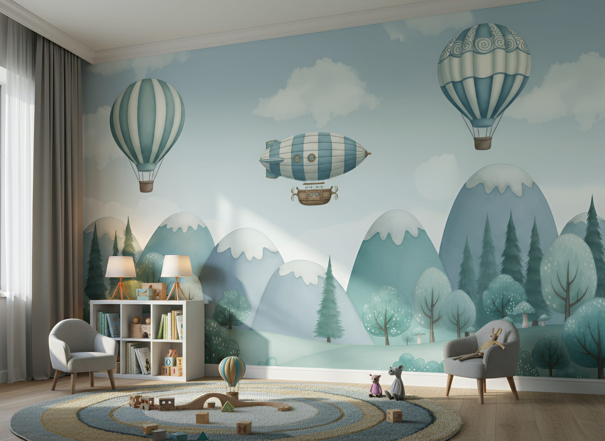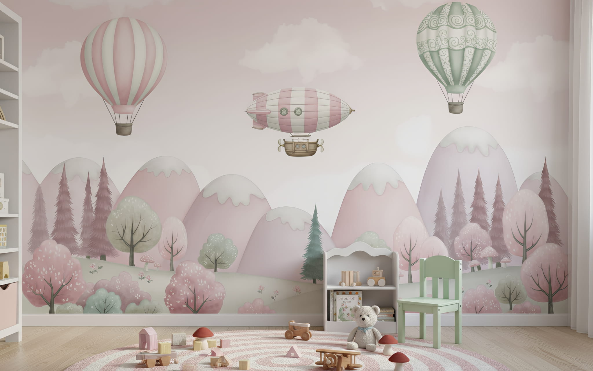 Fototapeta dla dzieci Tapeta las leśna góry balony sterowiec na wymiar FZL102
