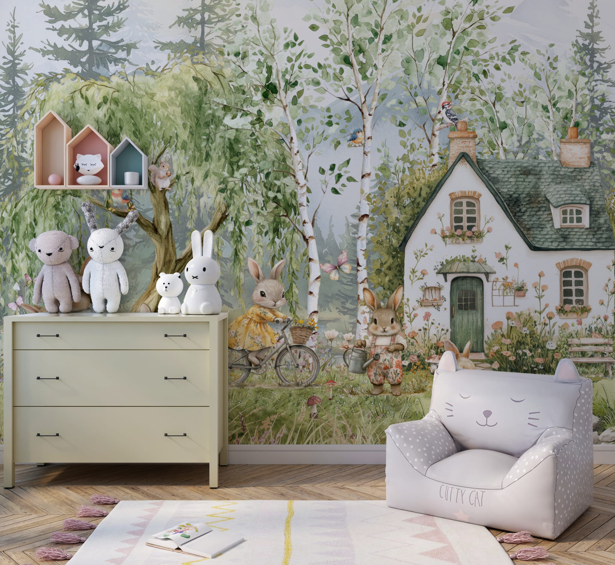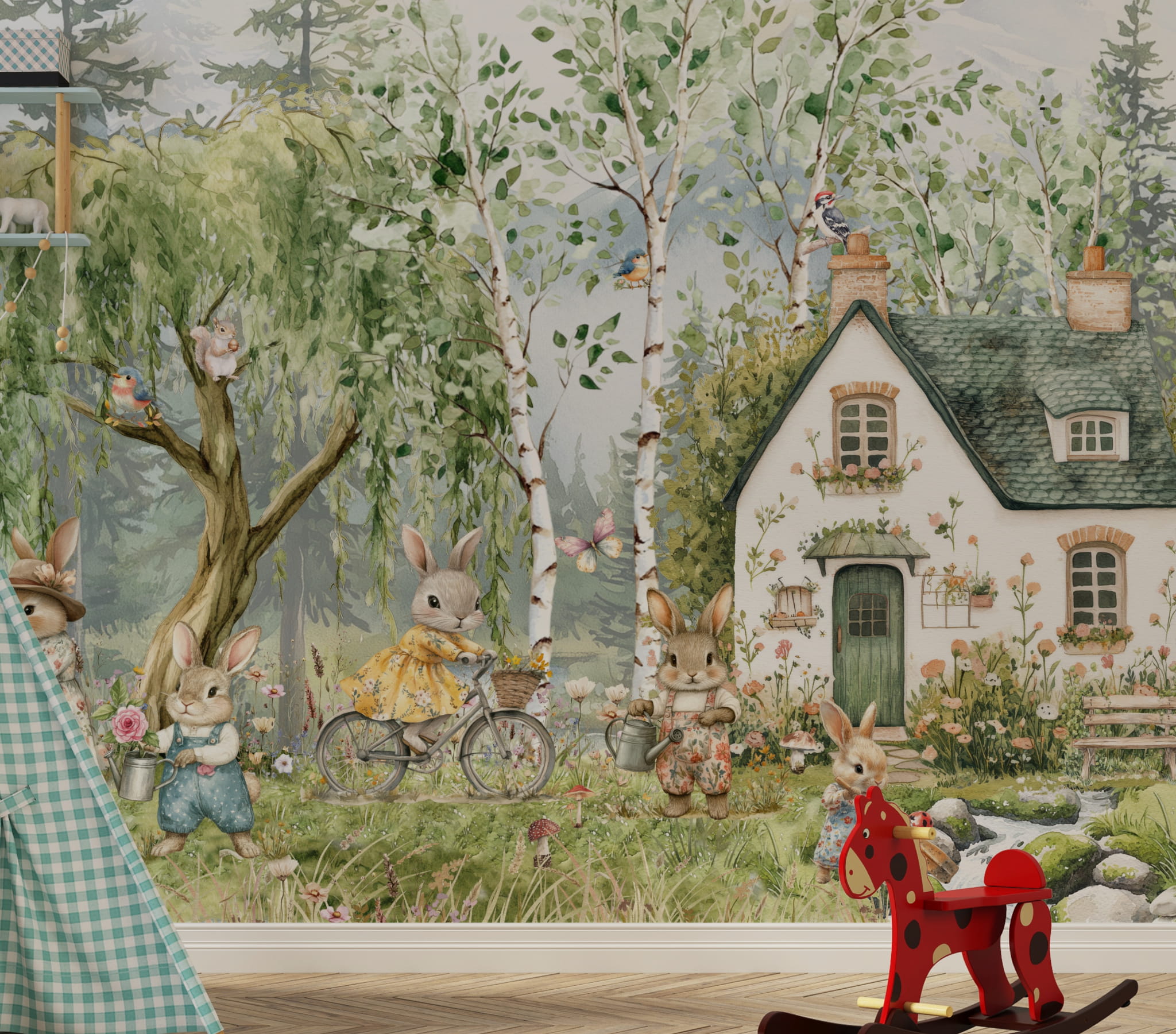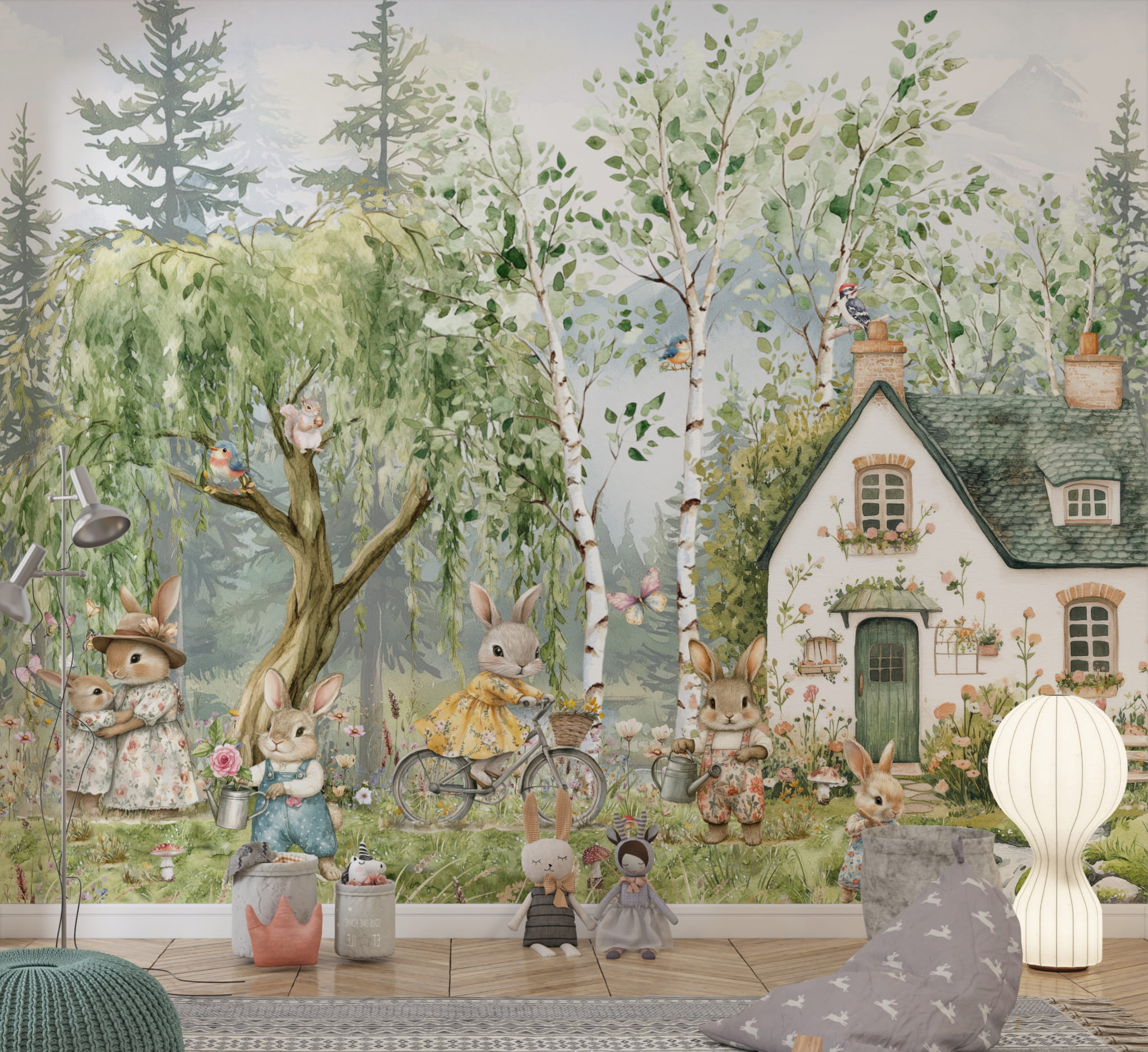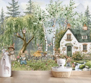 Fototapeta dla dzieci Tapeta las leśna zwierzęta króliki zające vintage leśne drzewa miś sarna wilk na wymiar FZL75