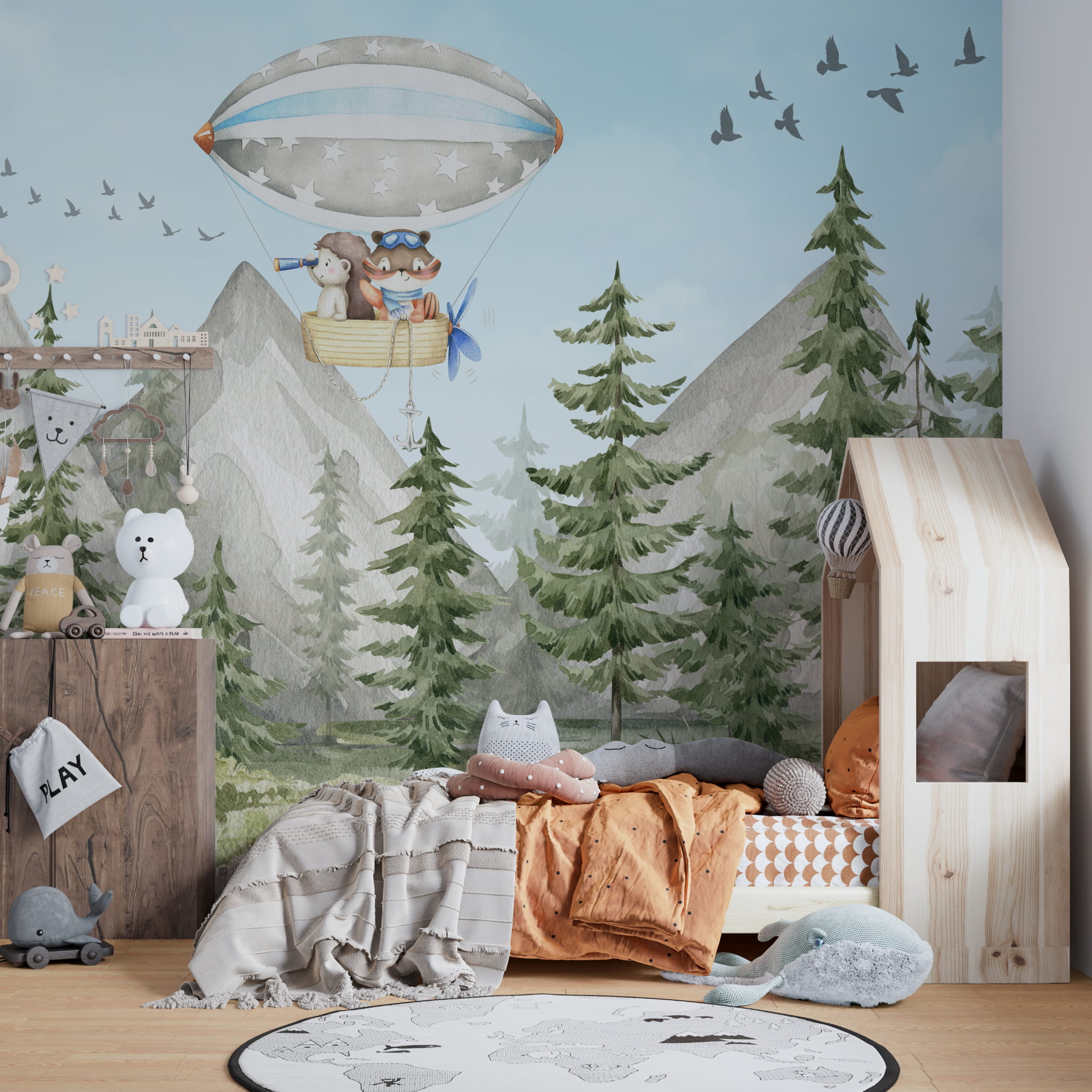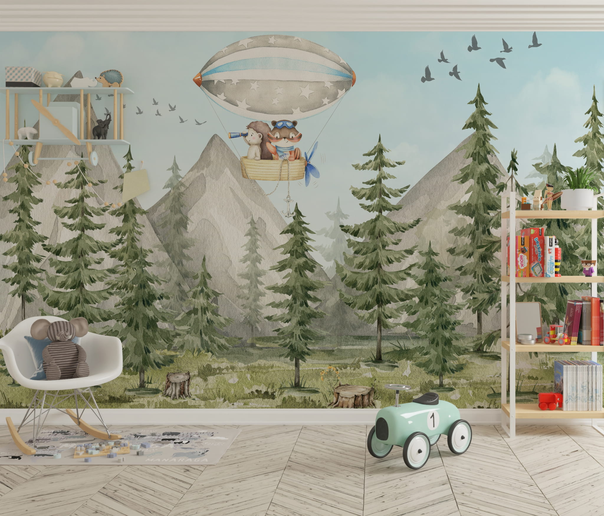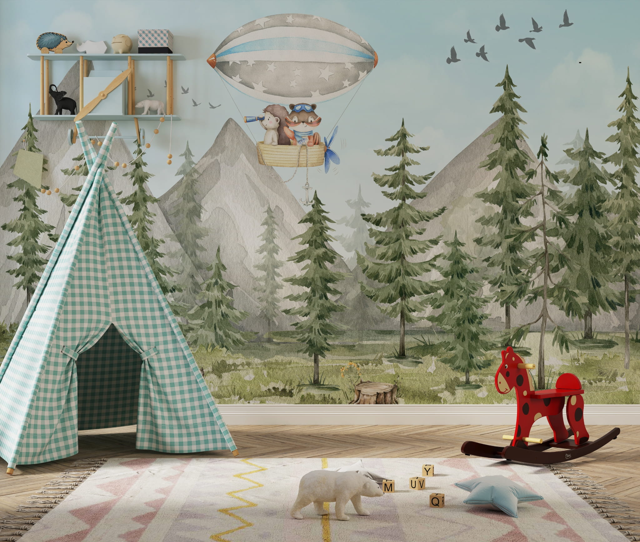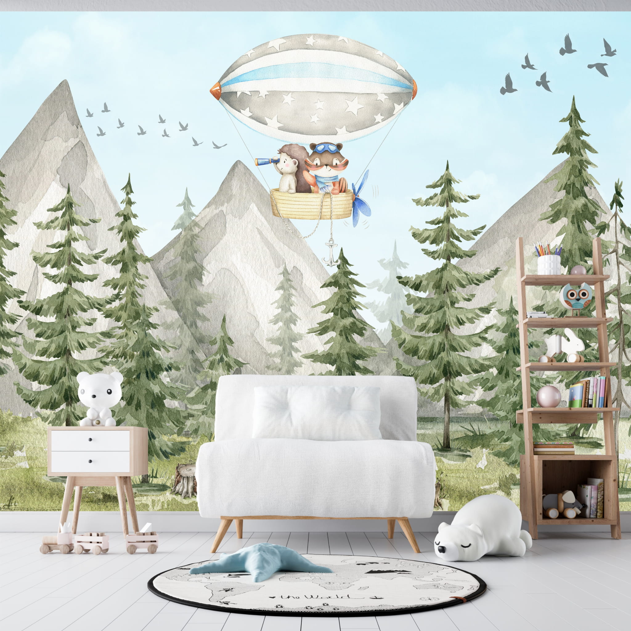 Fototapeta dla dzieci Tapeta las leśna zwierzęta leśne drzewa balony miś sarna wilk na wymiar FZL18