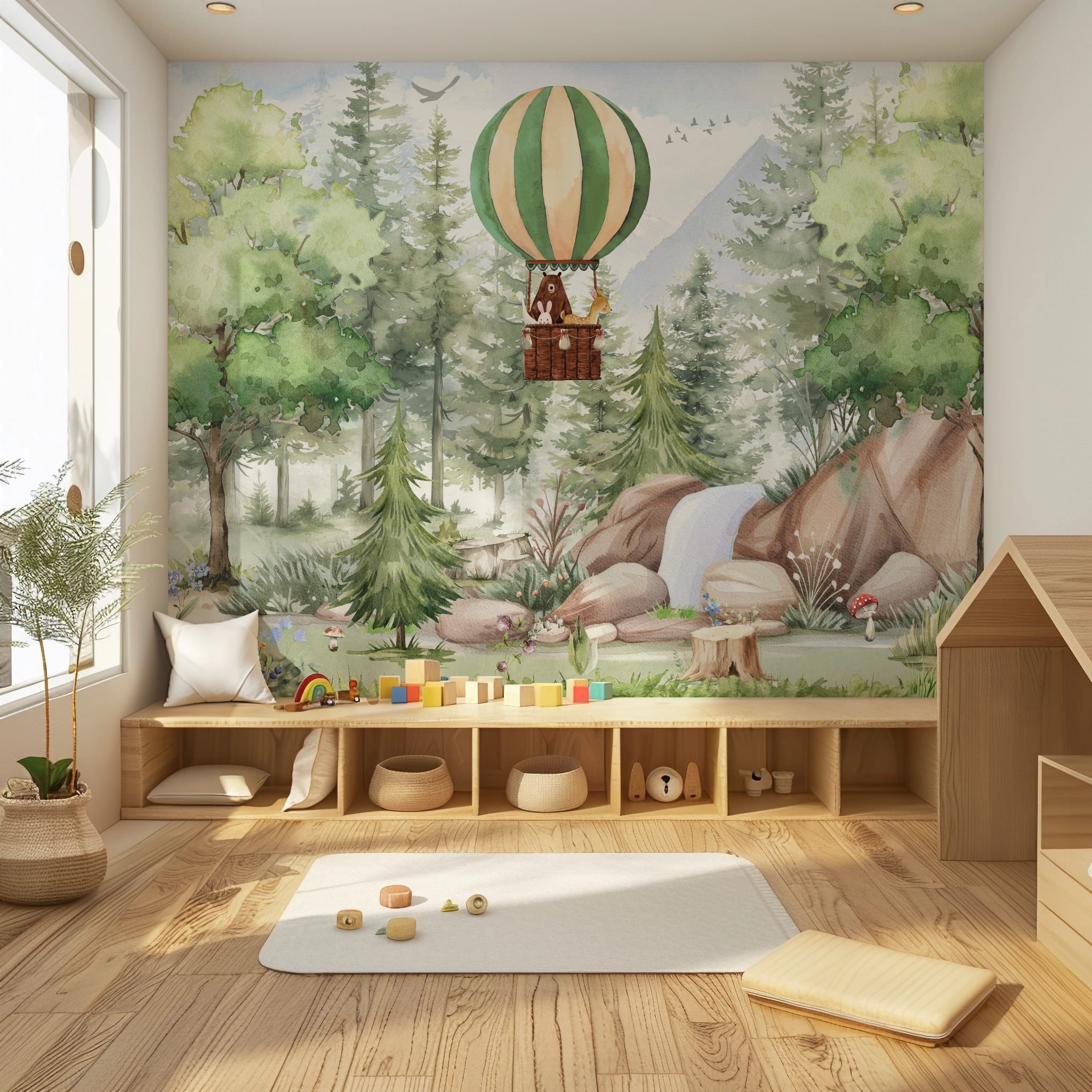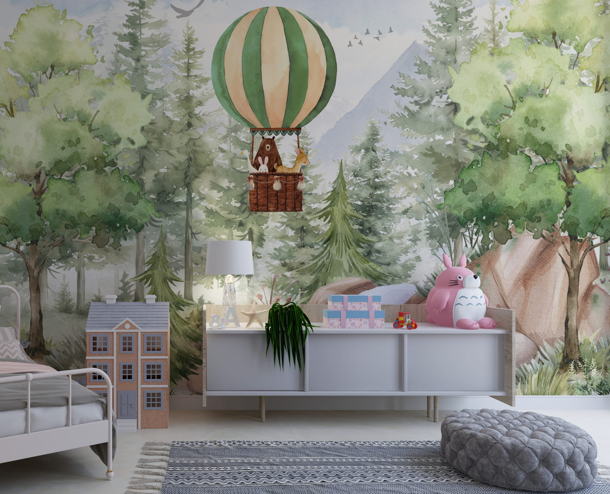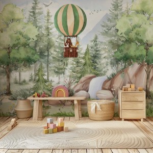 Fototapeta dla dzieci Tapeta las leśna zwierzęta leśne drzewa balony miś sarna wilk na wymiar FZL56