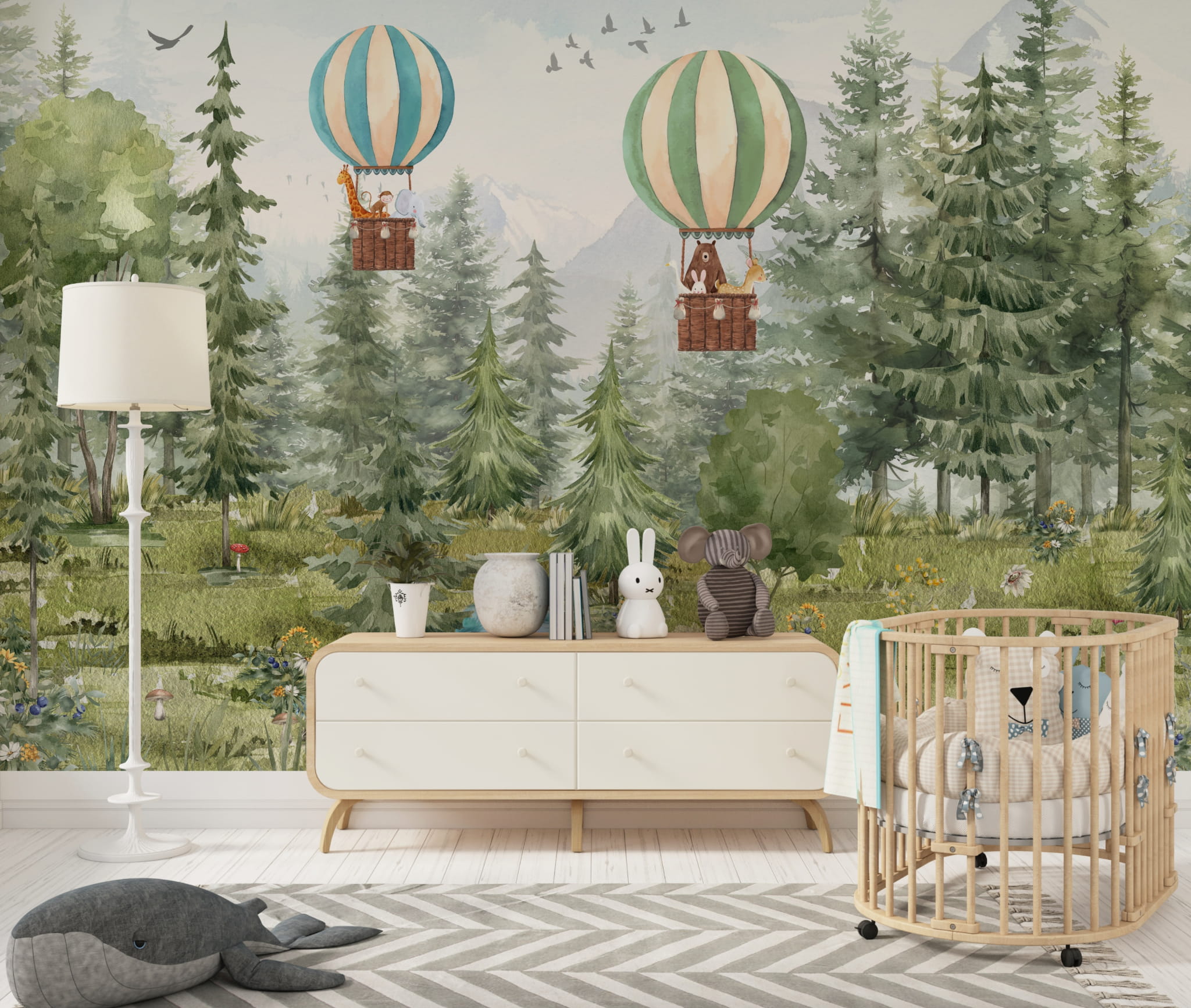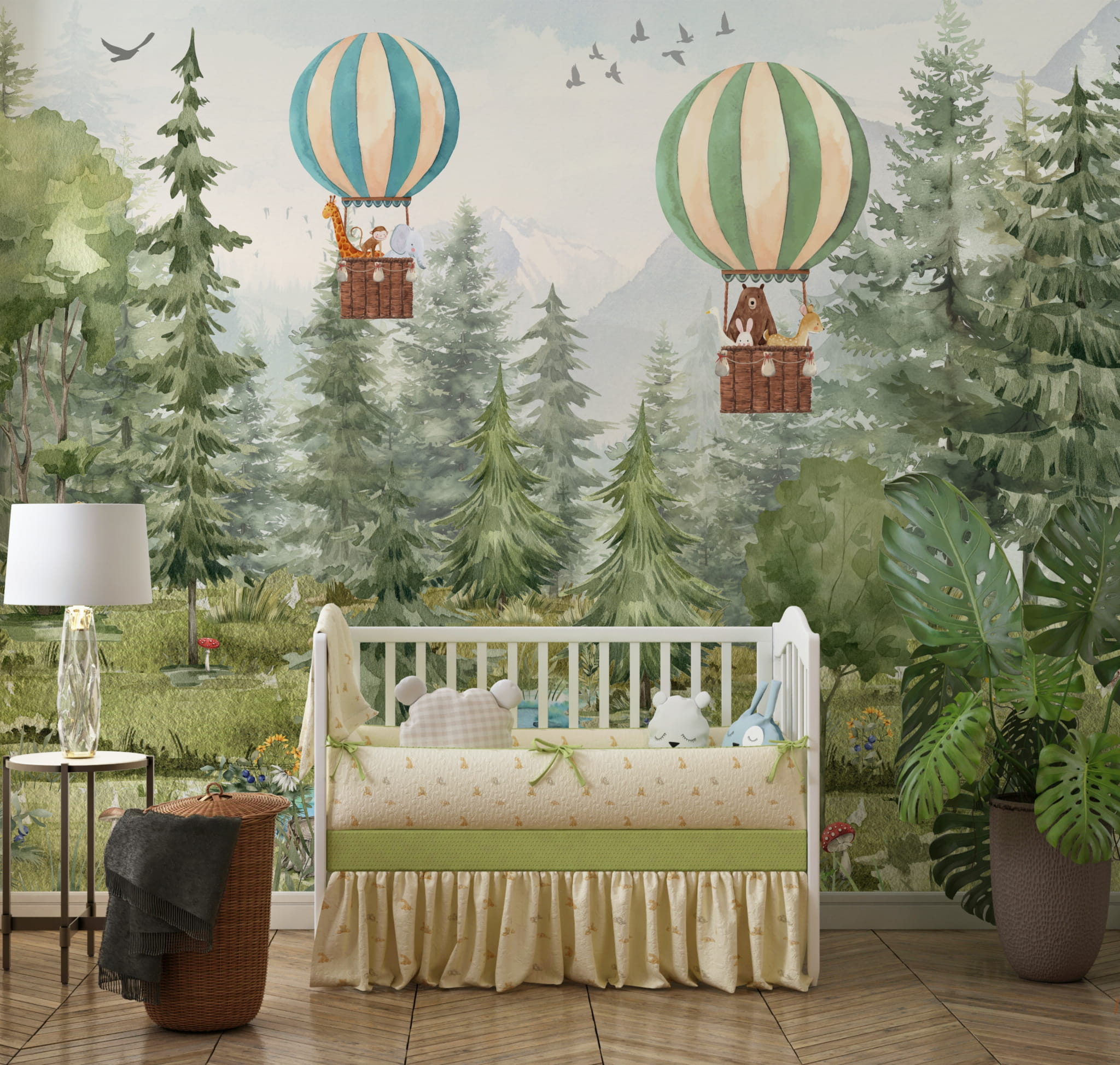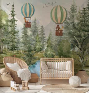 Fototapeta dla dzieci Tapeta las leśna zwierzęta leśne drzewa balony miś sarna wilk na wymiar FZL67