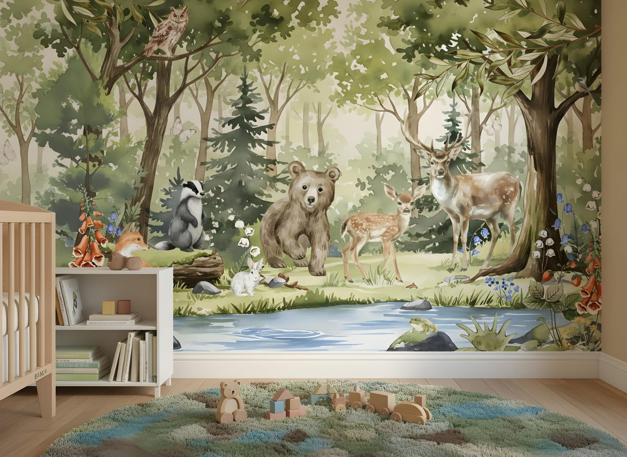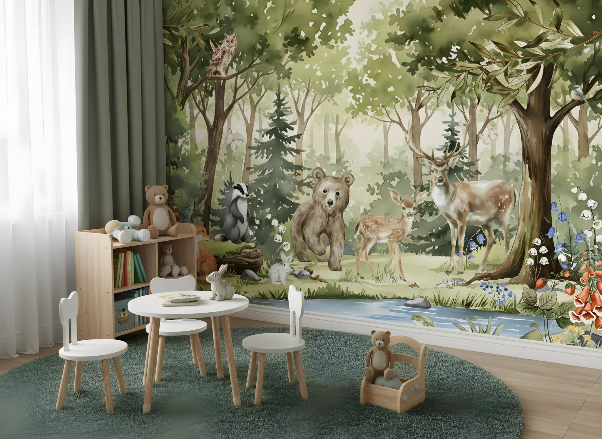 Fototapeta dla dzieci Tapeta las leśna zwierzęta leśne drzewa miś sarna balon jezioro na wymiar FZL108