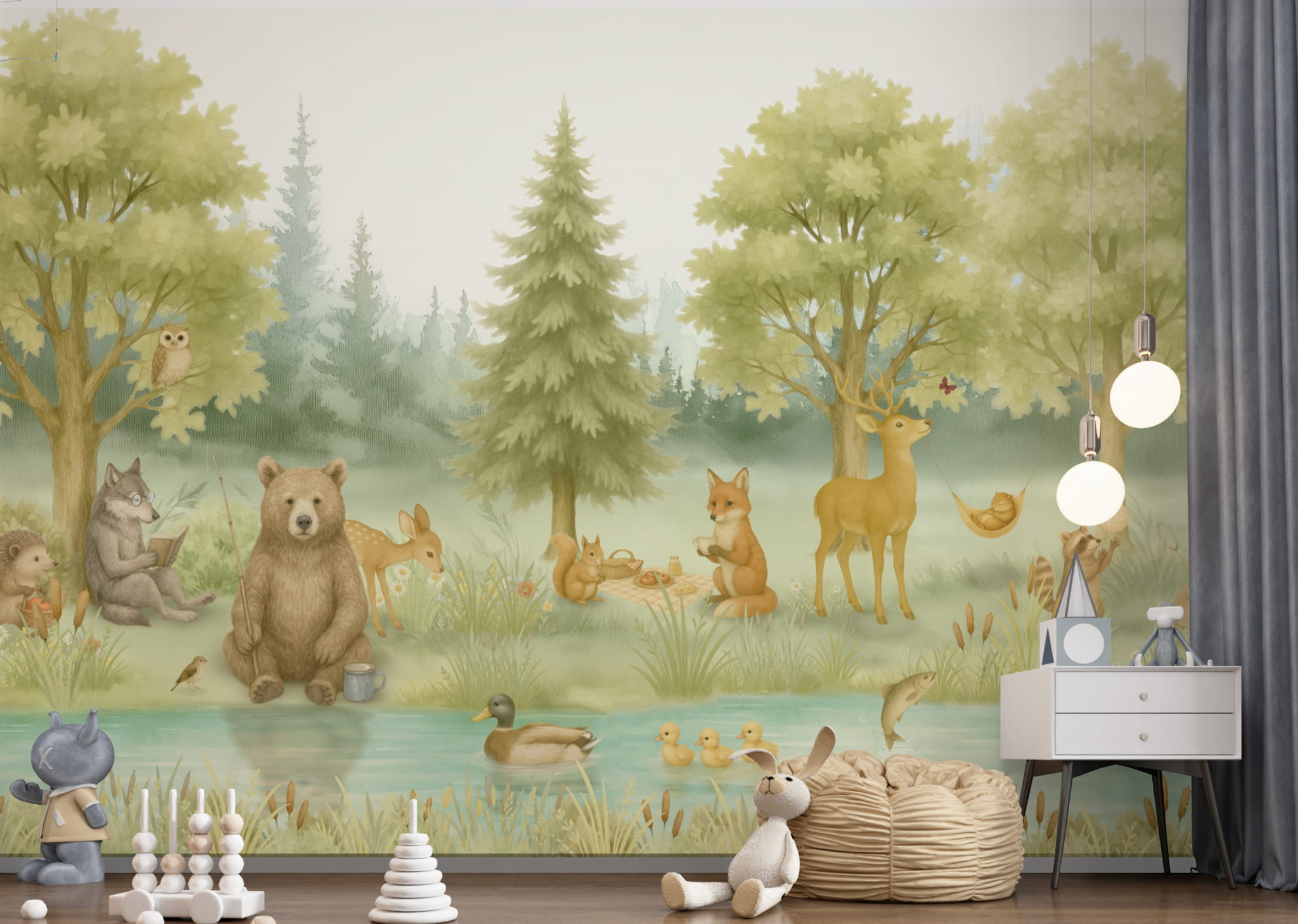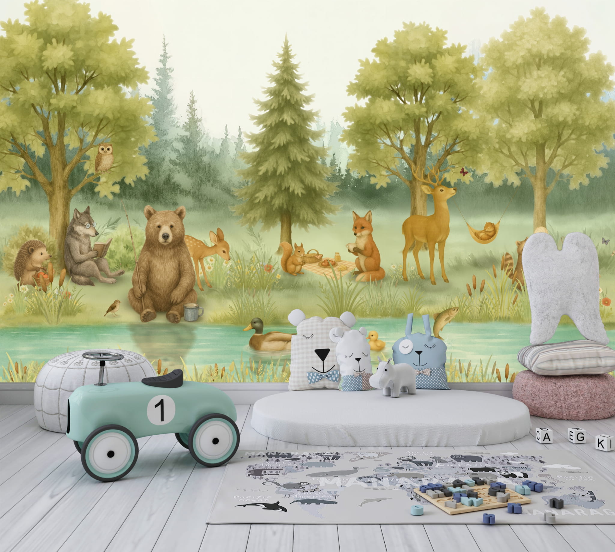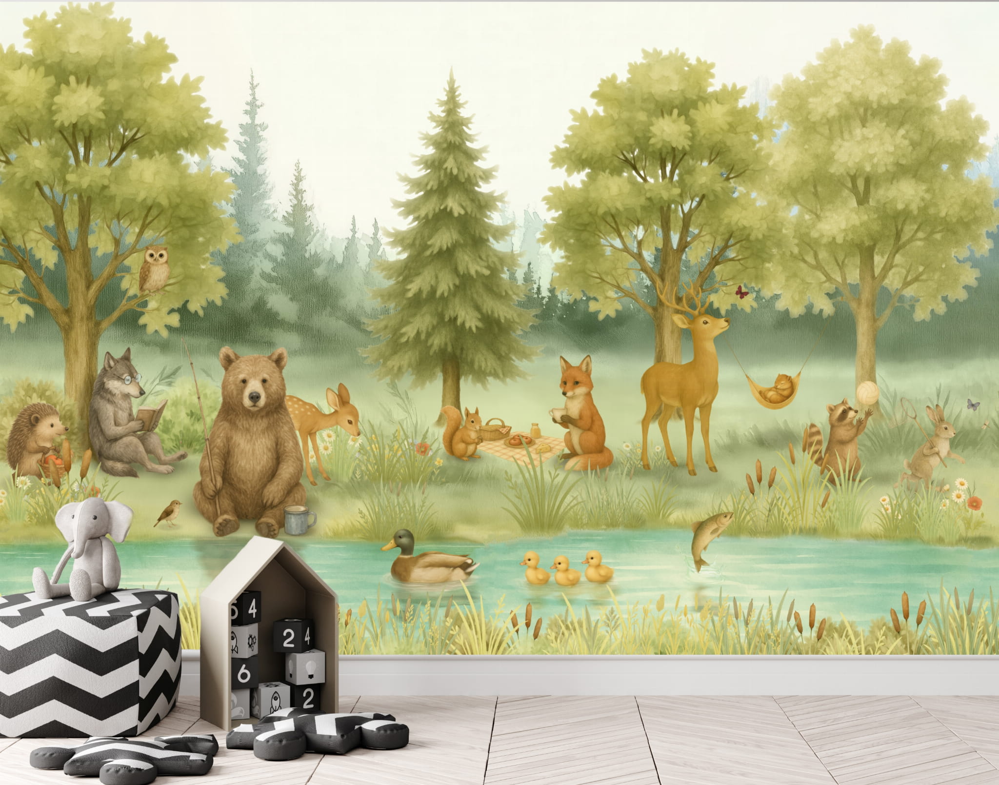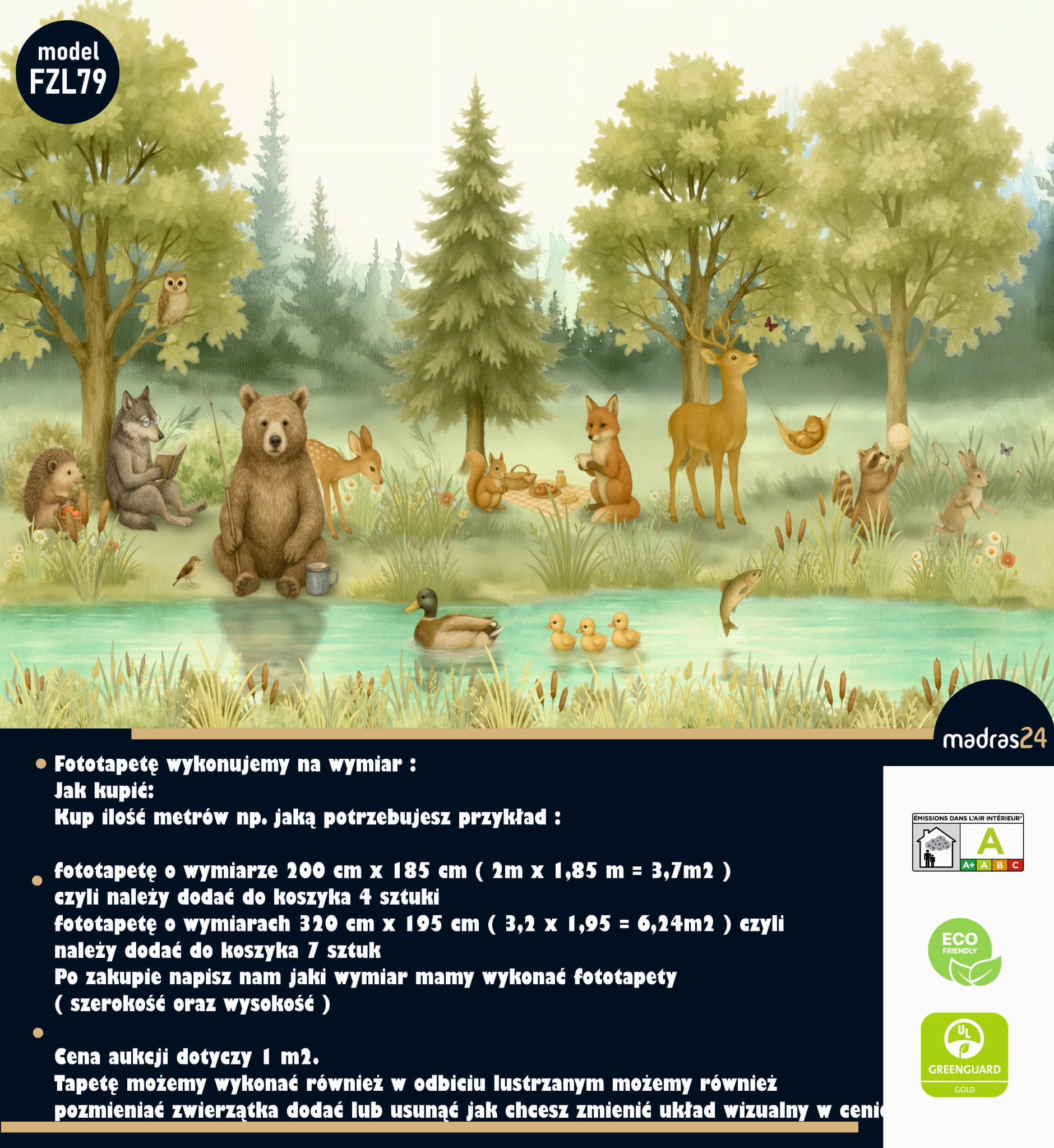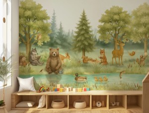 Fototapeta dla dzieci Tapeta las leśna zwierzęta leśne drzewa miś sarna wilk jezioro na wymiar FZL79)