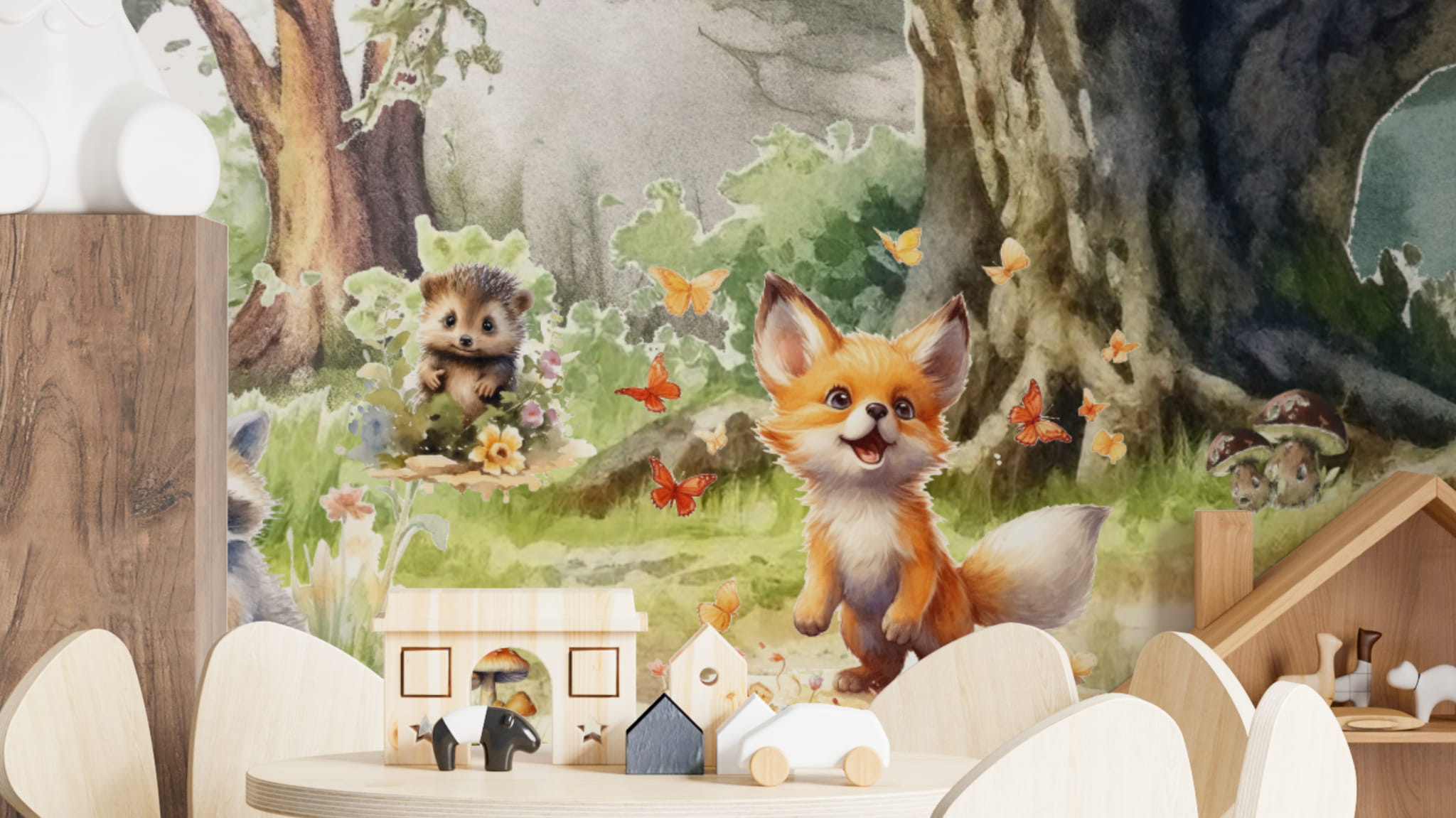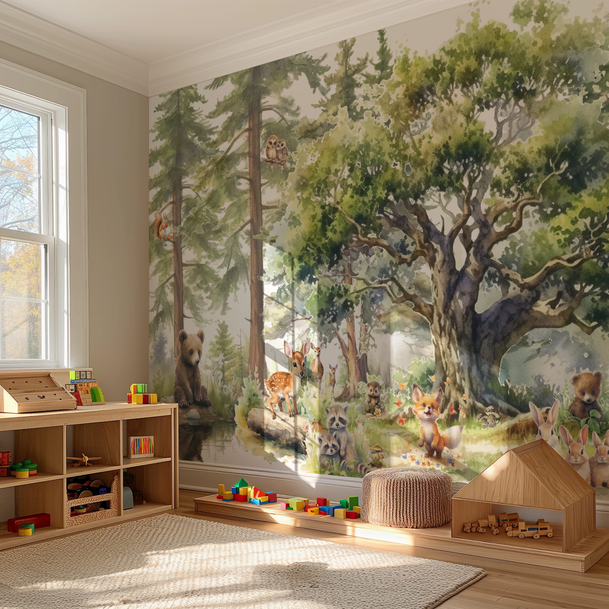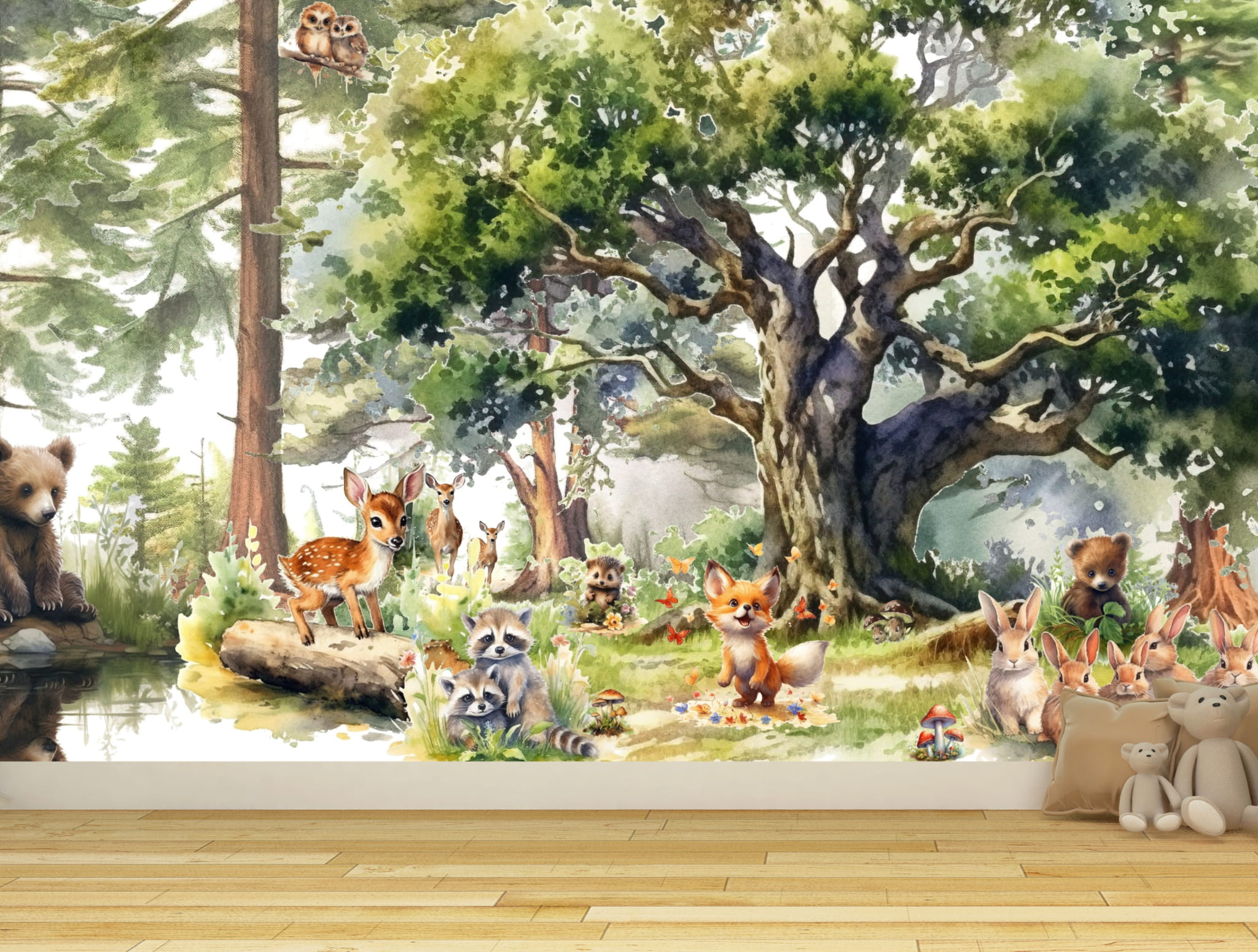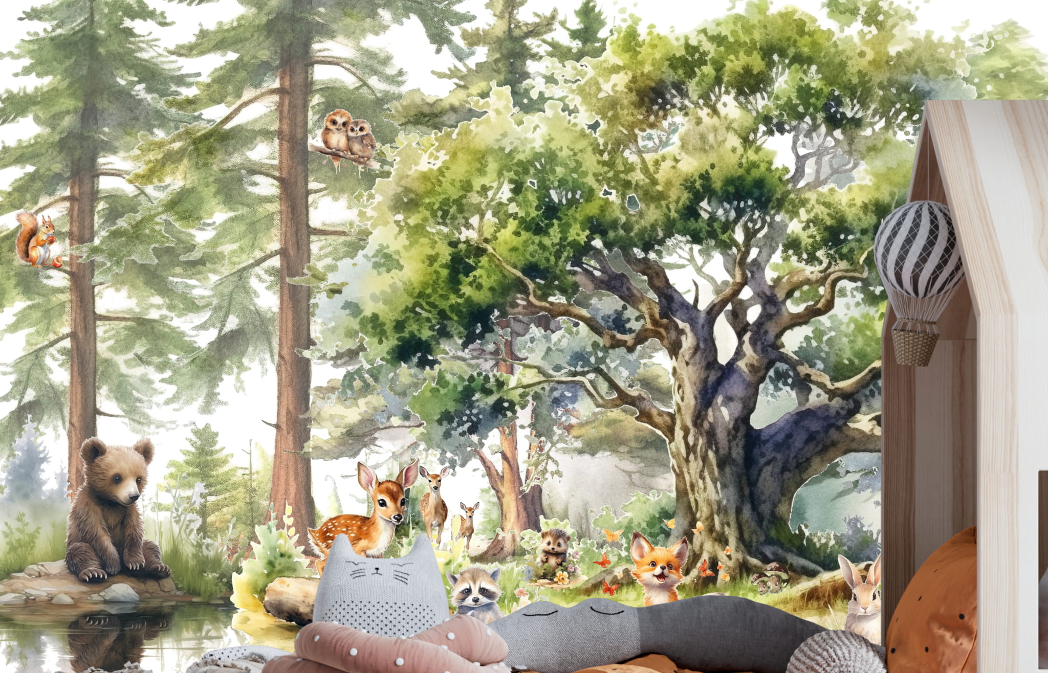 Fototapeta dla dzieci Tapeta las leśna zwierzęta leśne drzewa miś sarna wilk na wymiar FZL13outlet 412x313