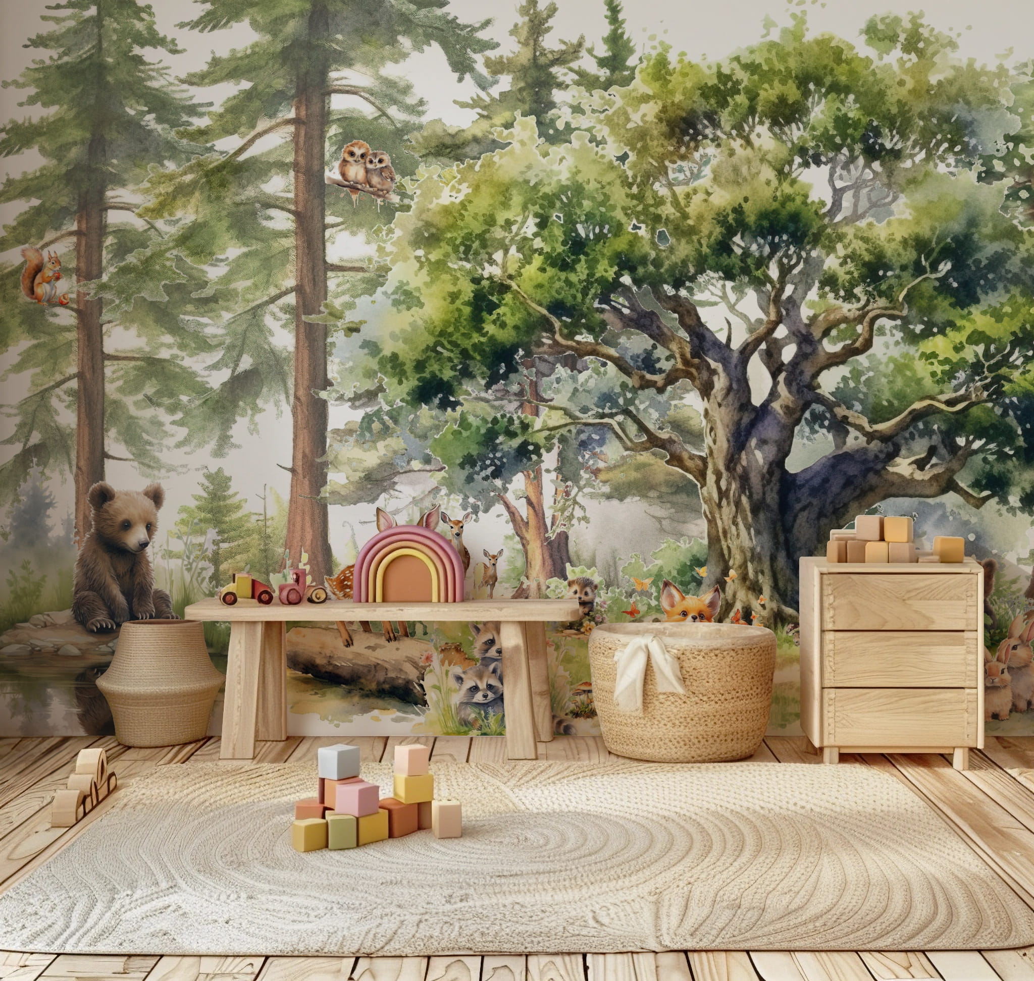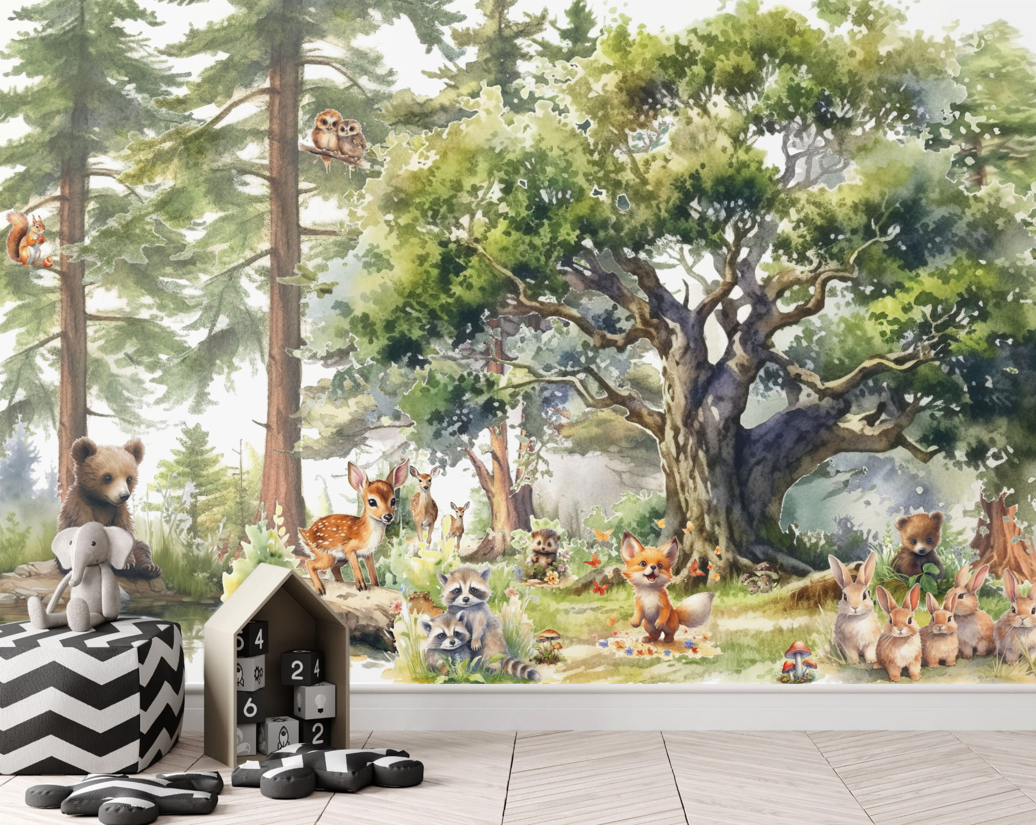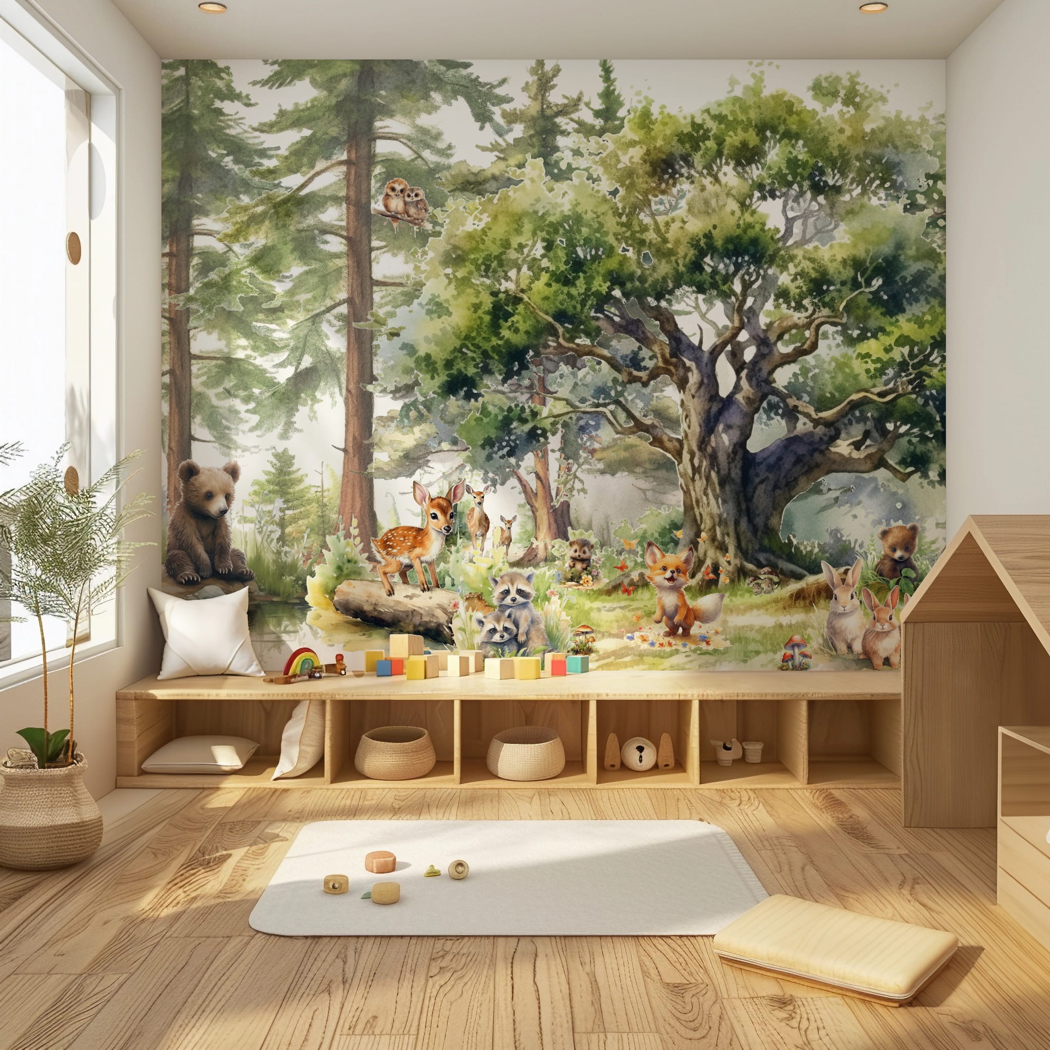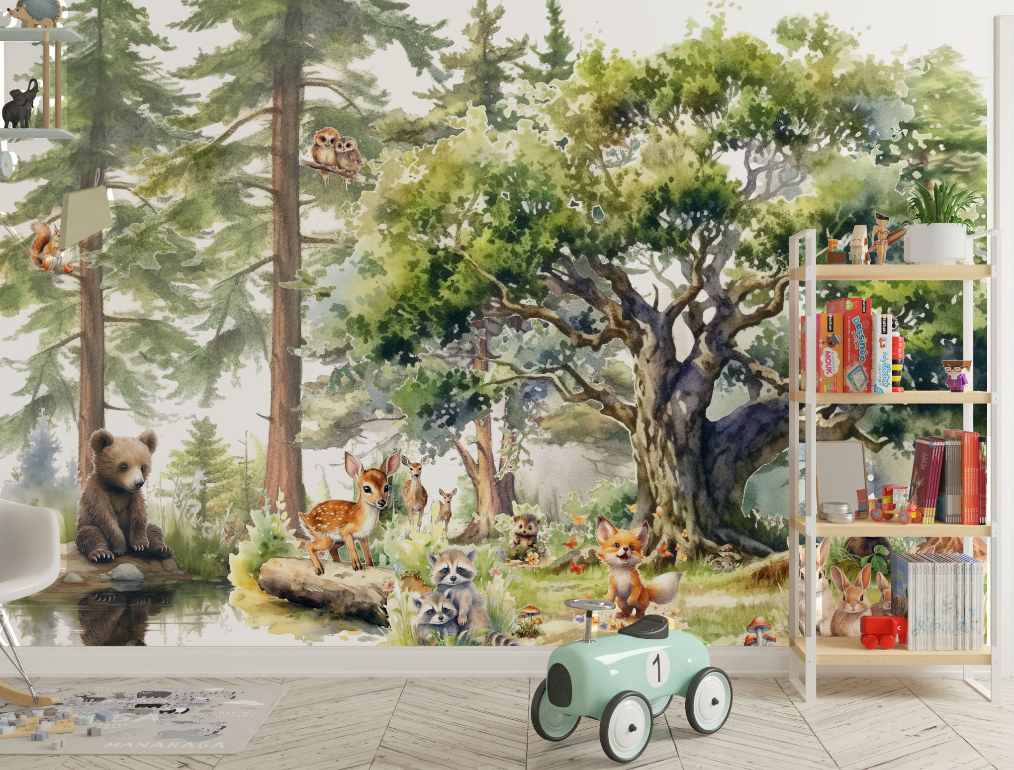 Fototapeta dla dzieci Tapeta las leśna zwierzęta leśne drzewa miś sarna wilk na wymiar FZL13outlet 412x313