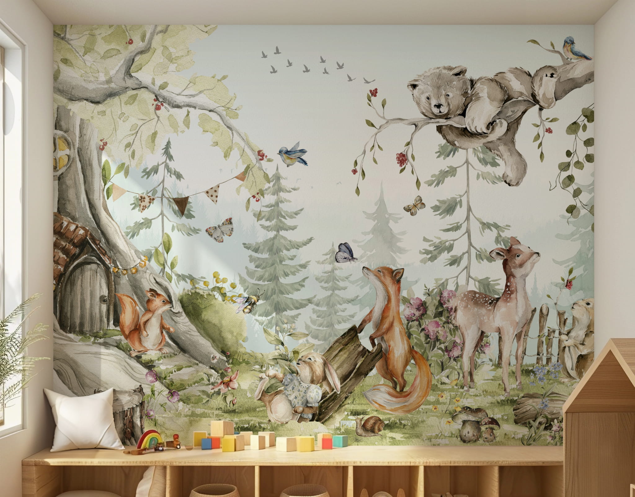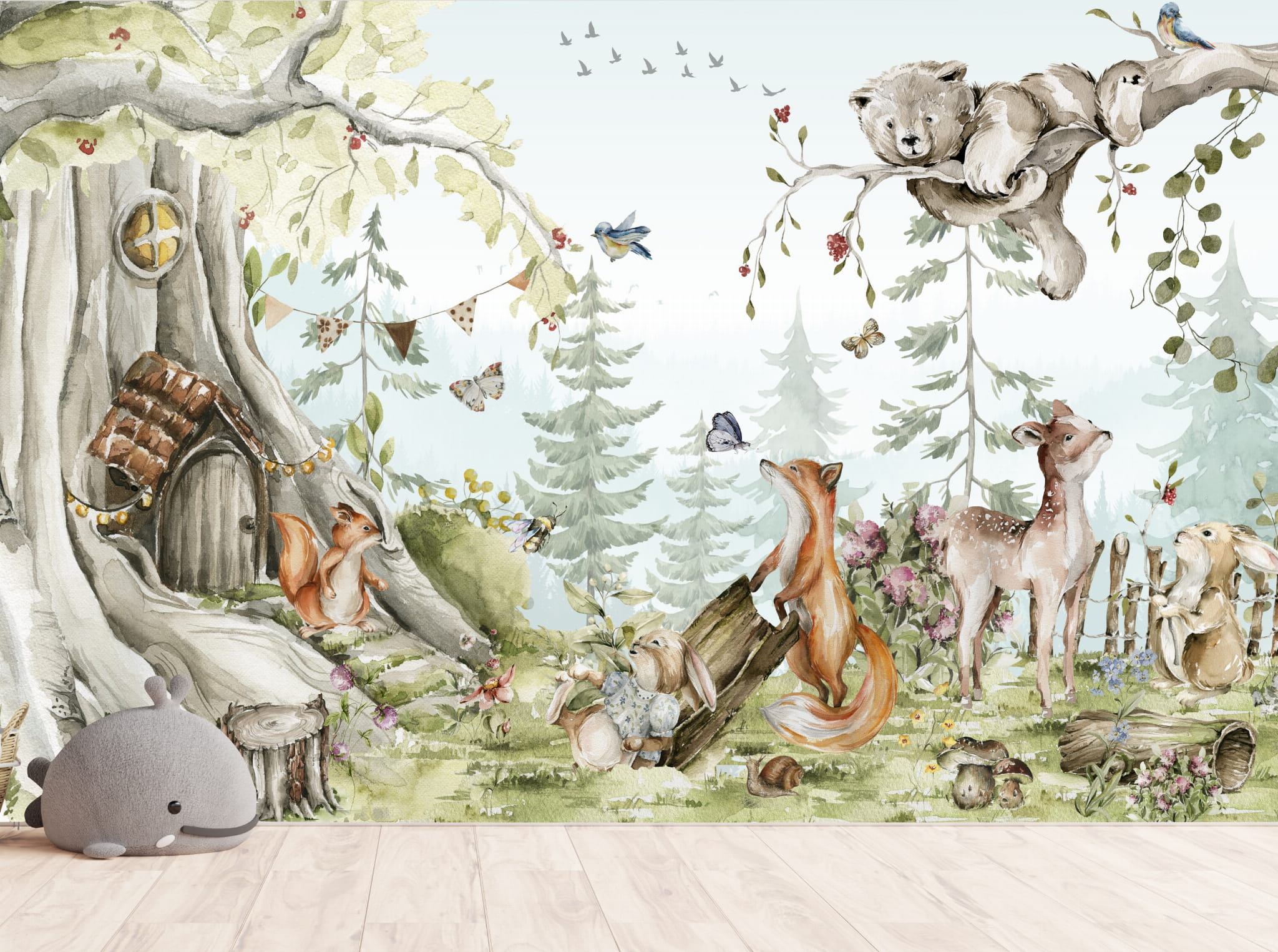 Fototapeta dla dzieci Tapeta las leśna zwierzęta leśne drzewa miś sarna wilk na wymiar FZL23