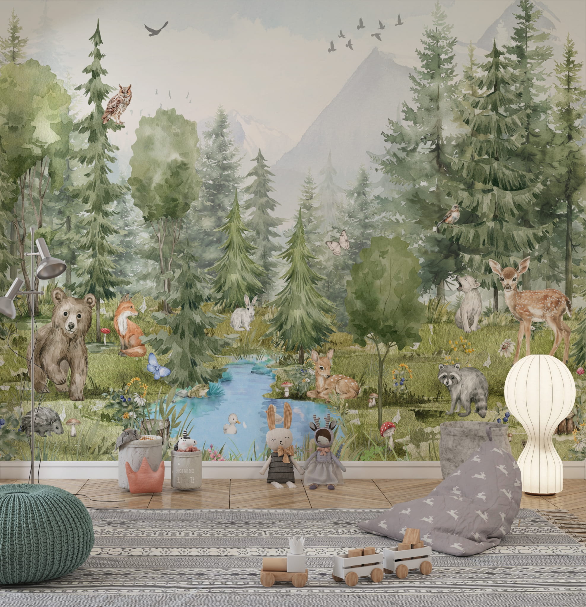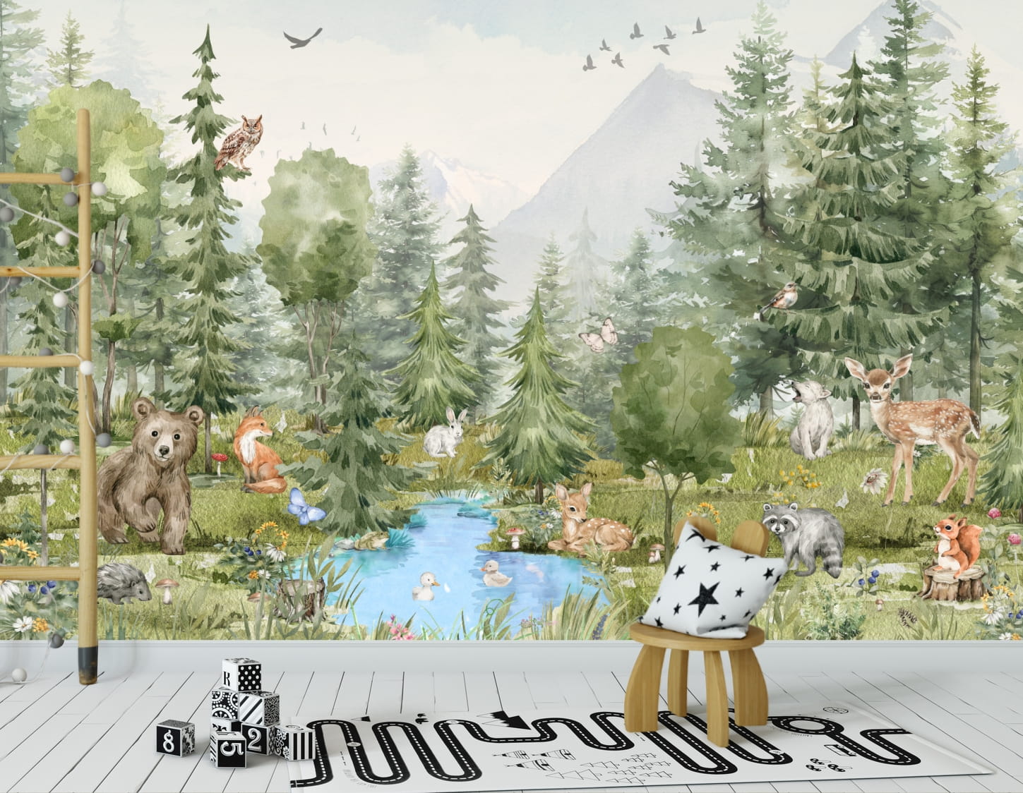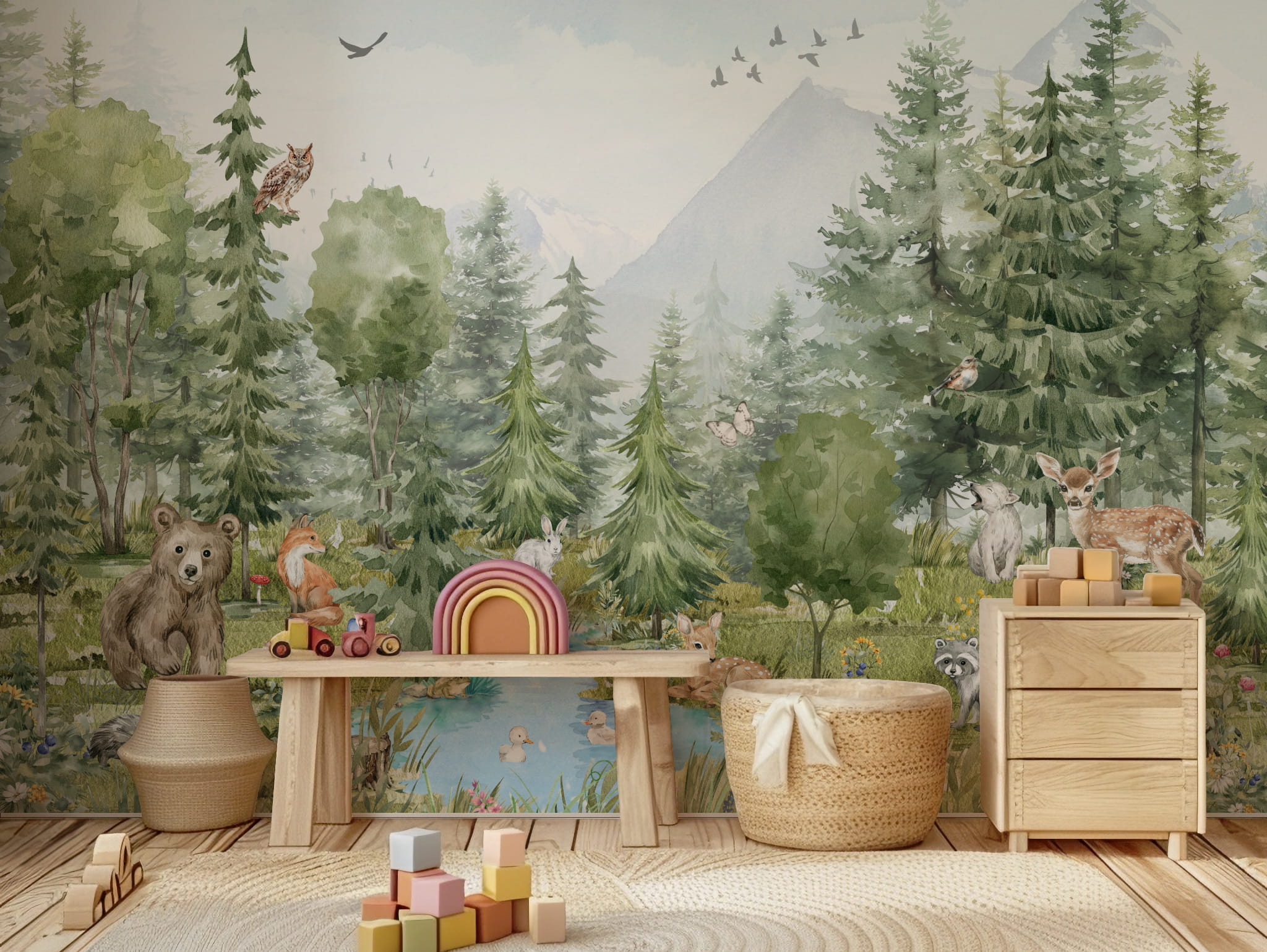 Fototapeta dla dzieci Tapeta las leśna zwierzęta leśne drzewa miś sarna wilk na wymiar FZL65