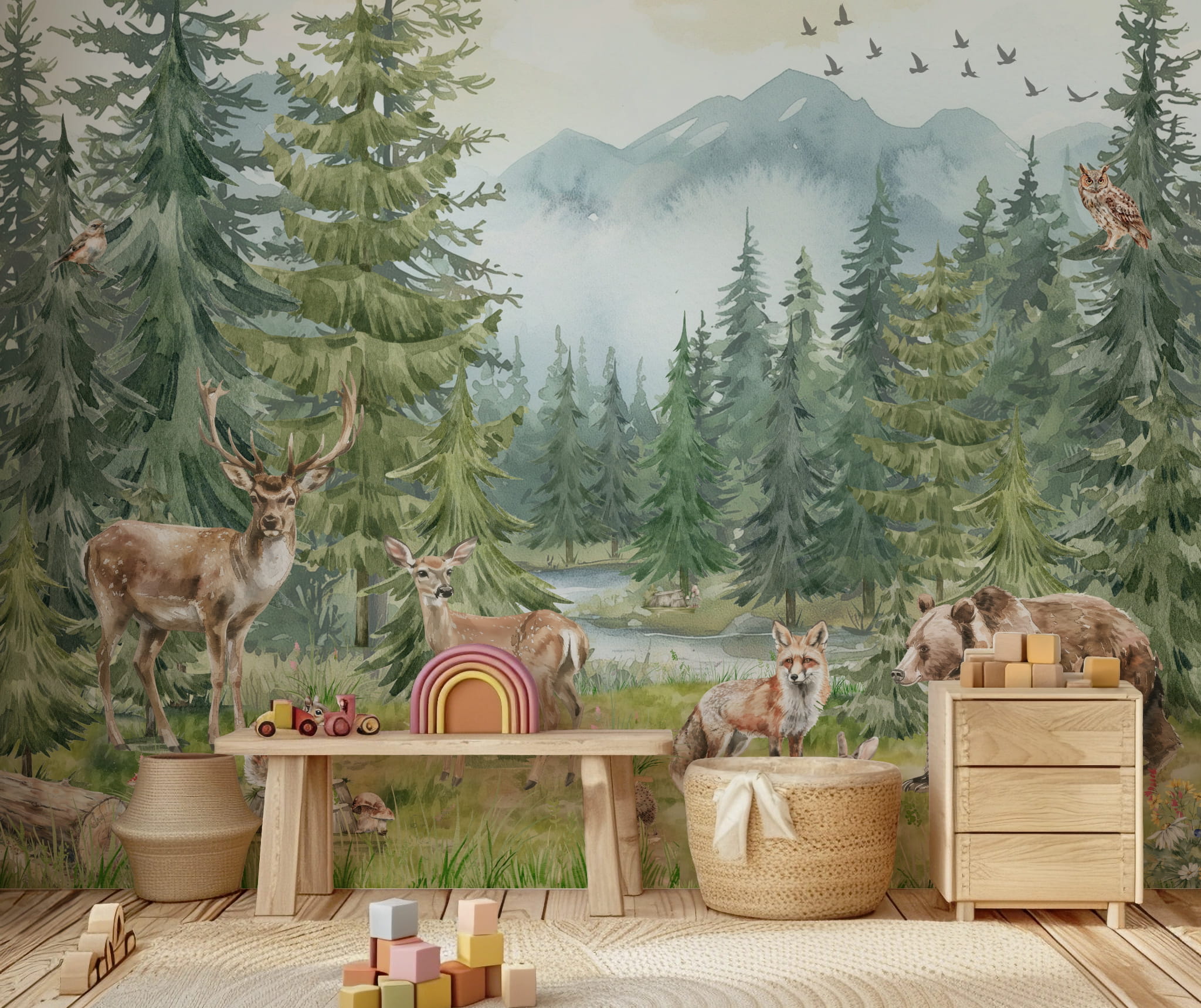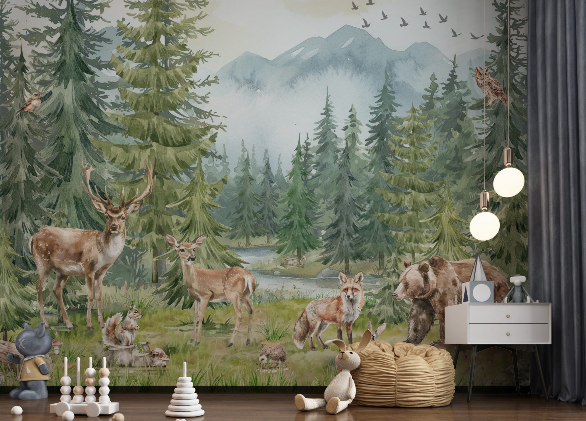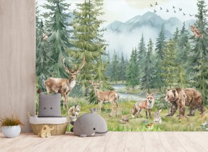 Fototapeta dla dzieci Tapeta las leśna zwierzęta leśne drzewa miś sarna wilk na wymiar FZL71