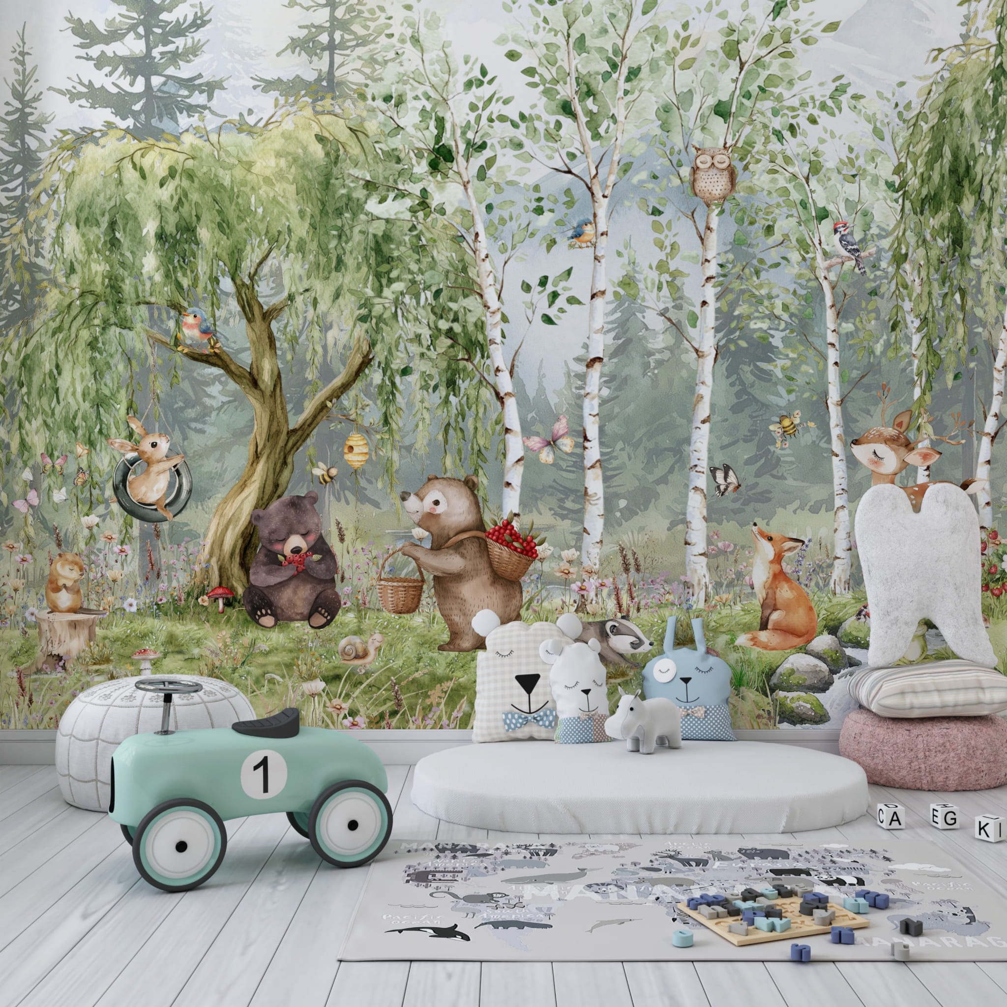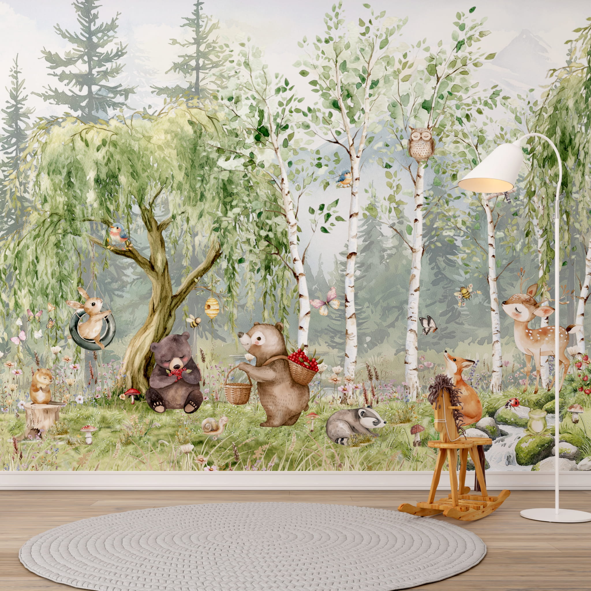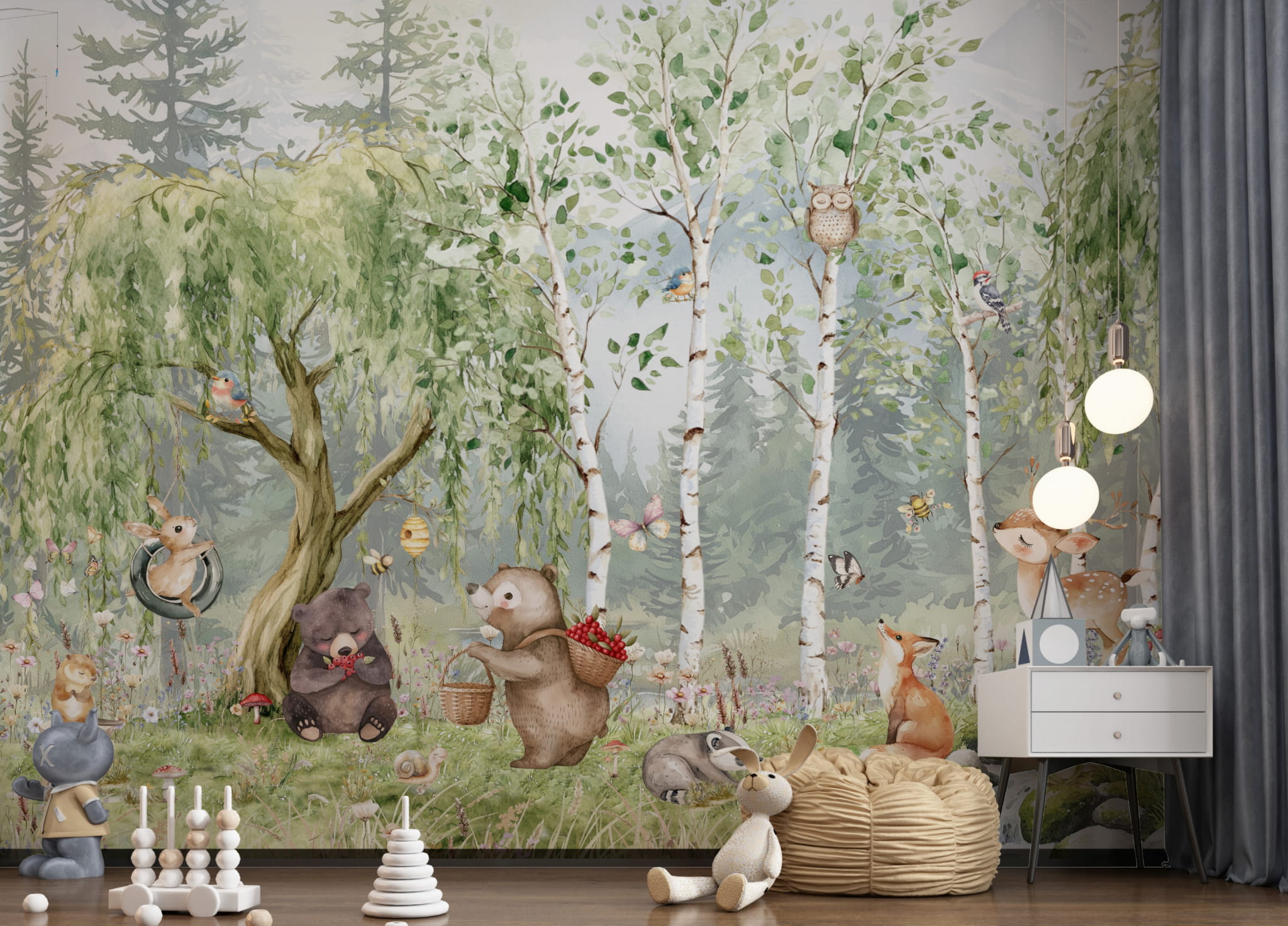 Fototapeta dla dzieci Tapeta las leśna zwierzęta leśne drzewa miś sarna wilk na wymiar FZL77)