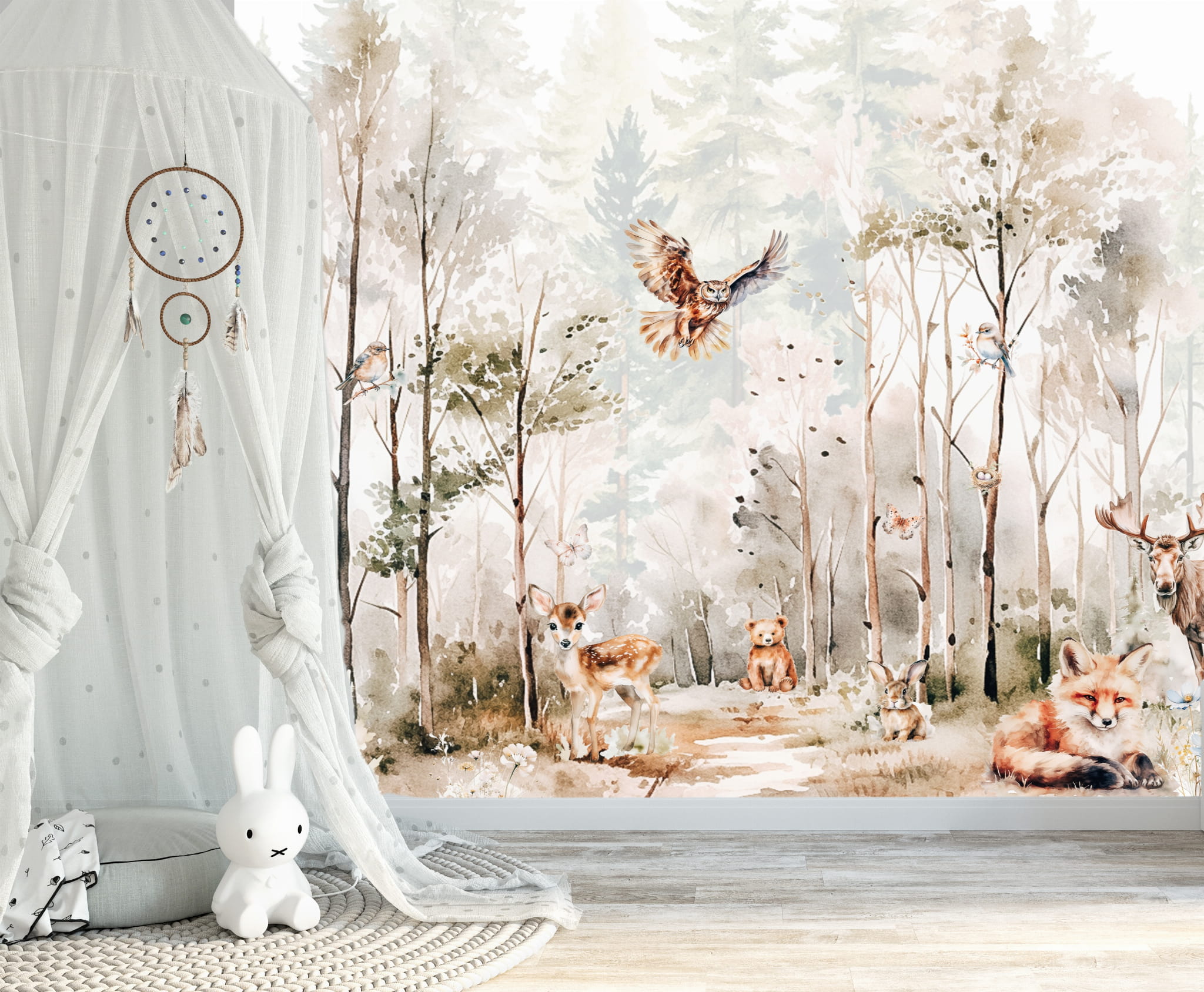 Fototapeta dla dzieci Tapeta las leśna zwierzęta leśne drzewa sarna miś królik na wymiar FZL31
