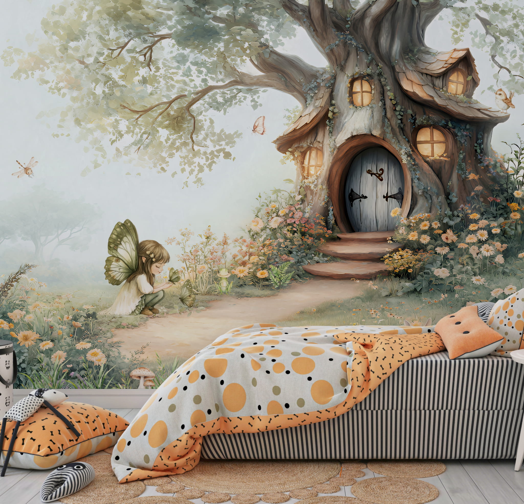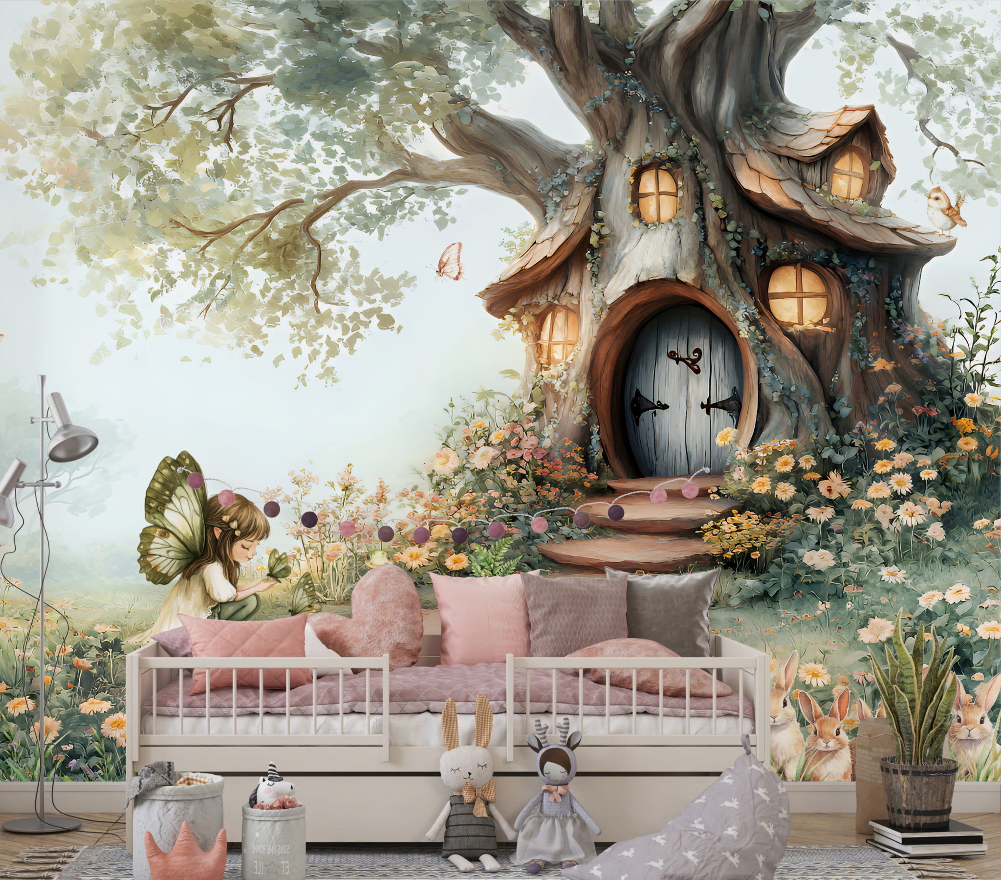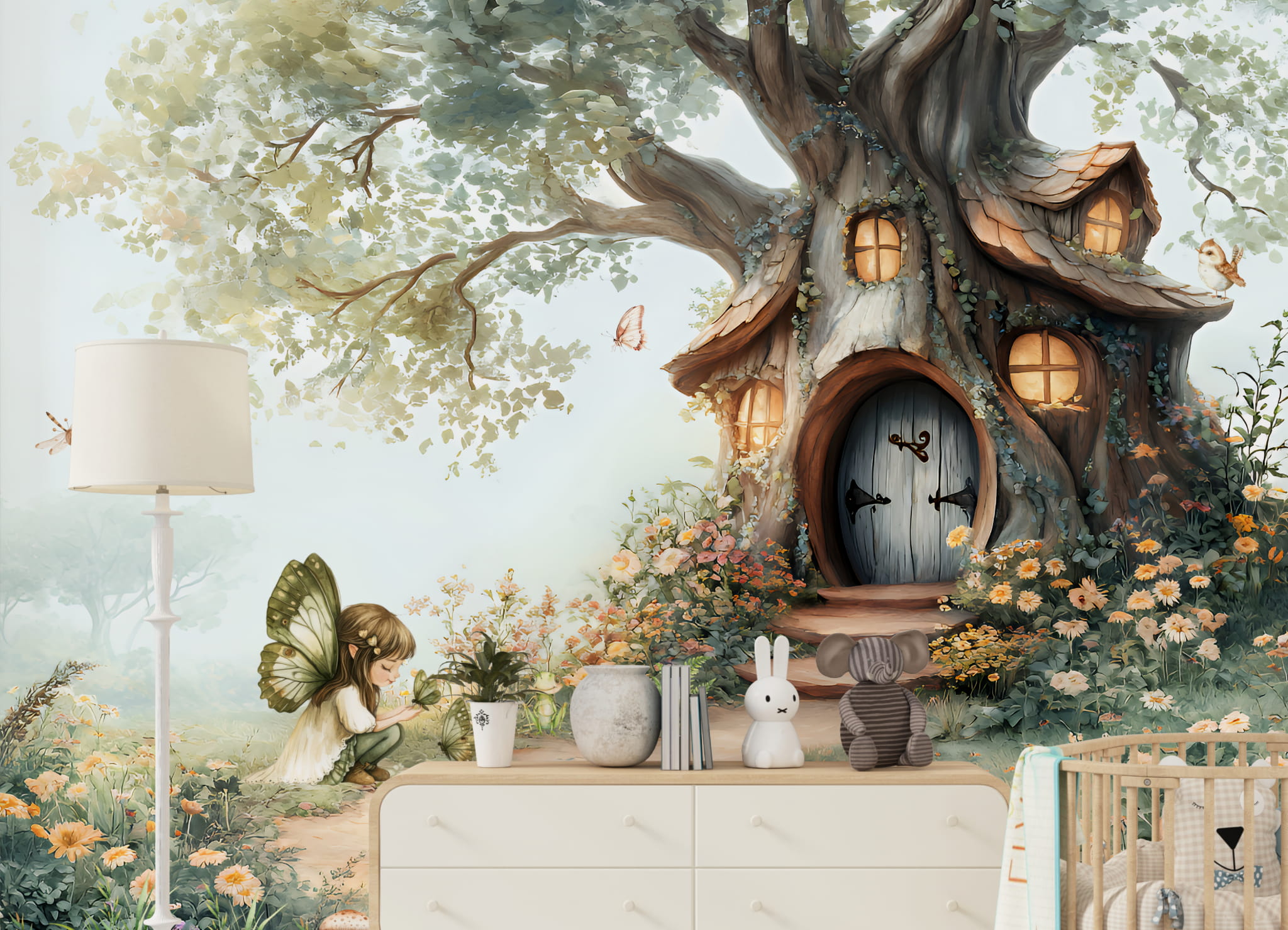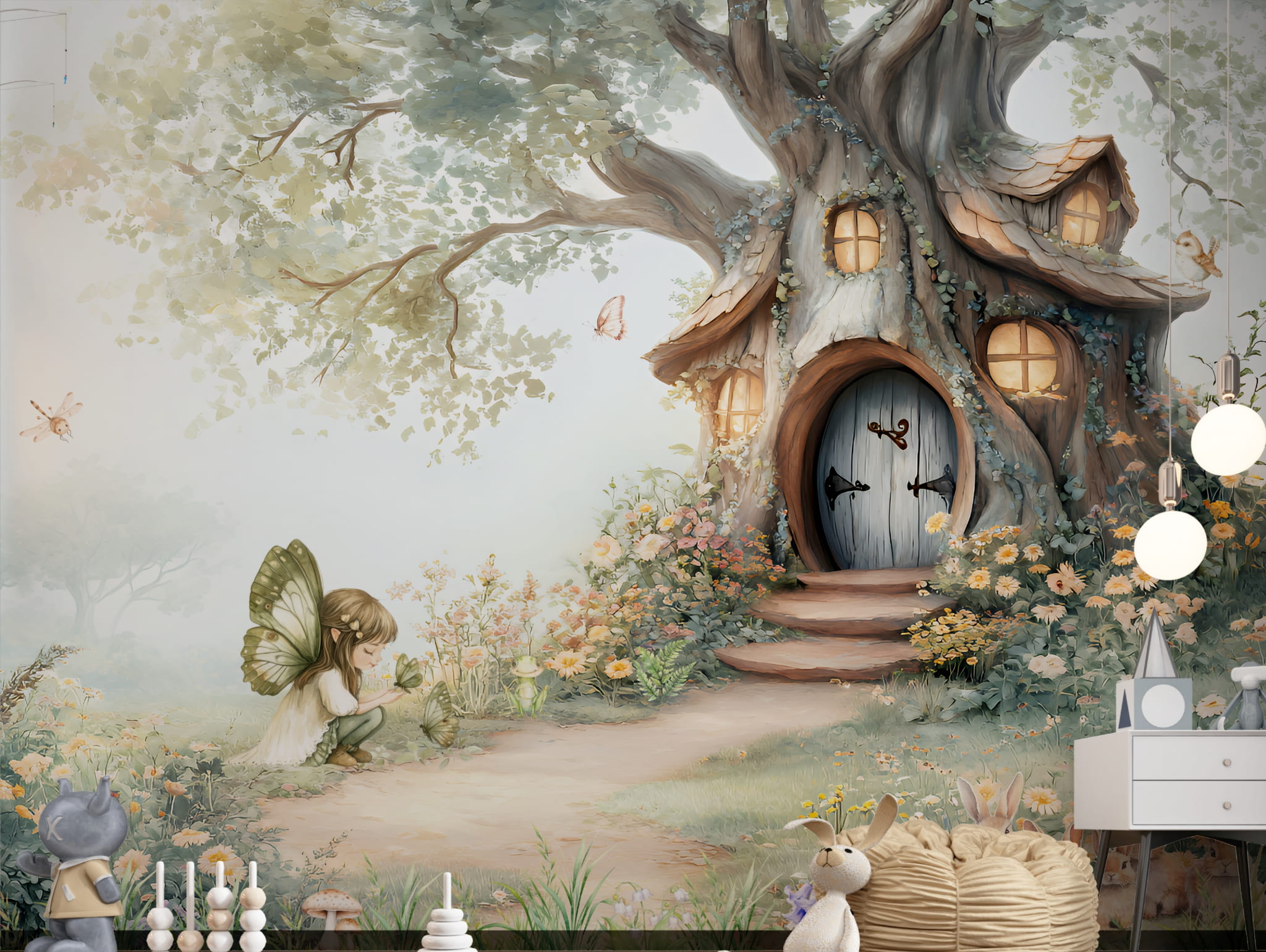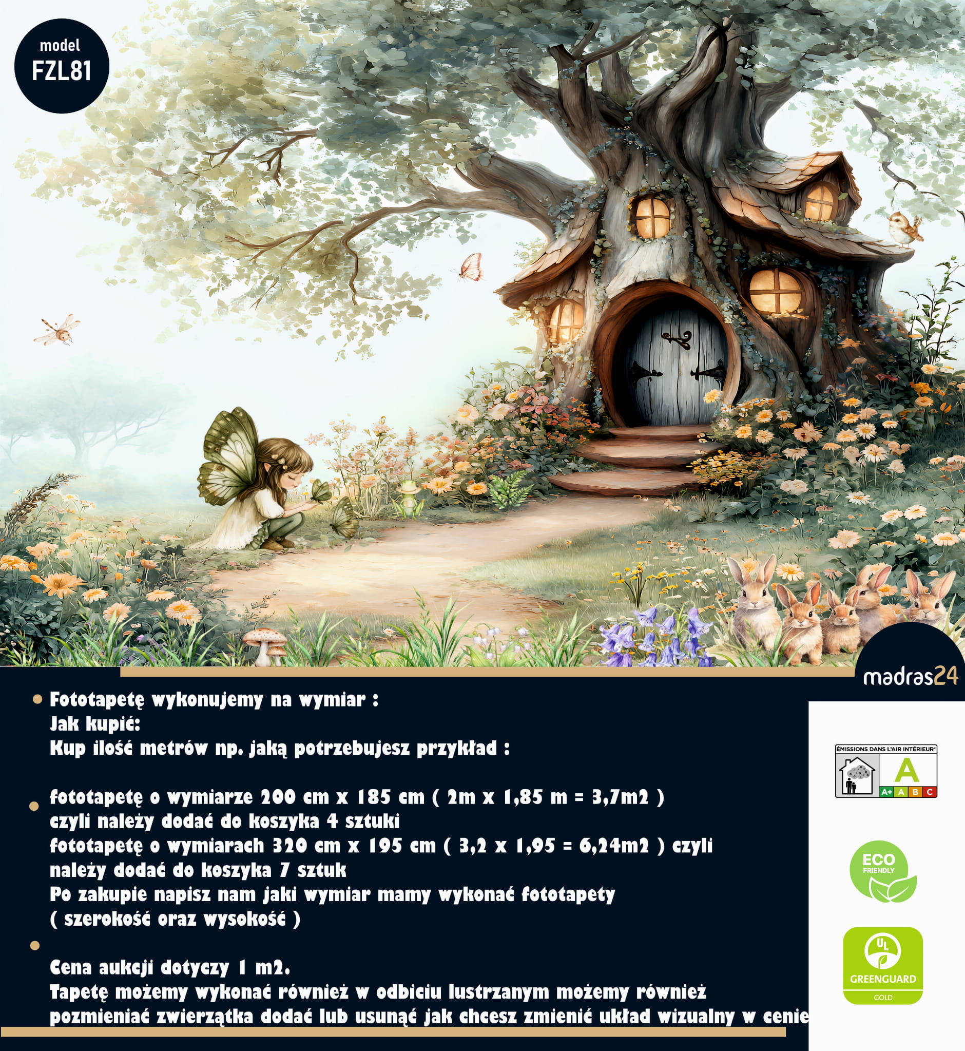 Fototapeta dla dzieci Tapeta wróżki , elfy , bajkowy świat elfów , las leśna zwierzęta magiczny domek na drzewie