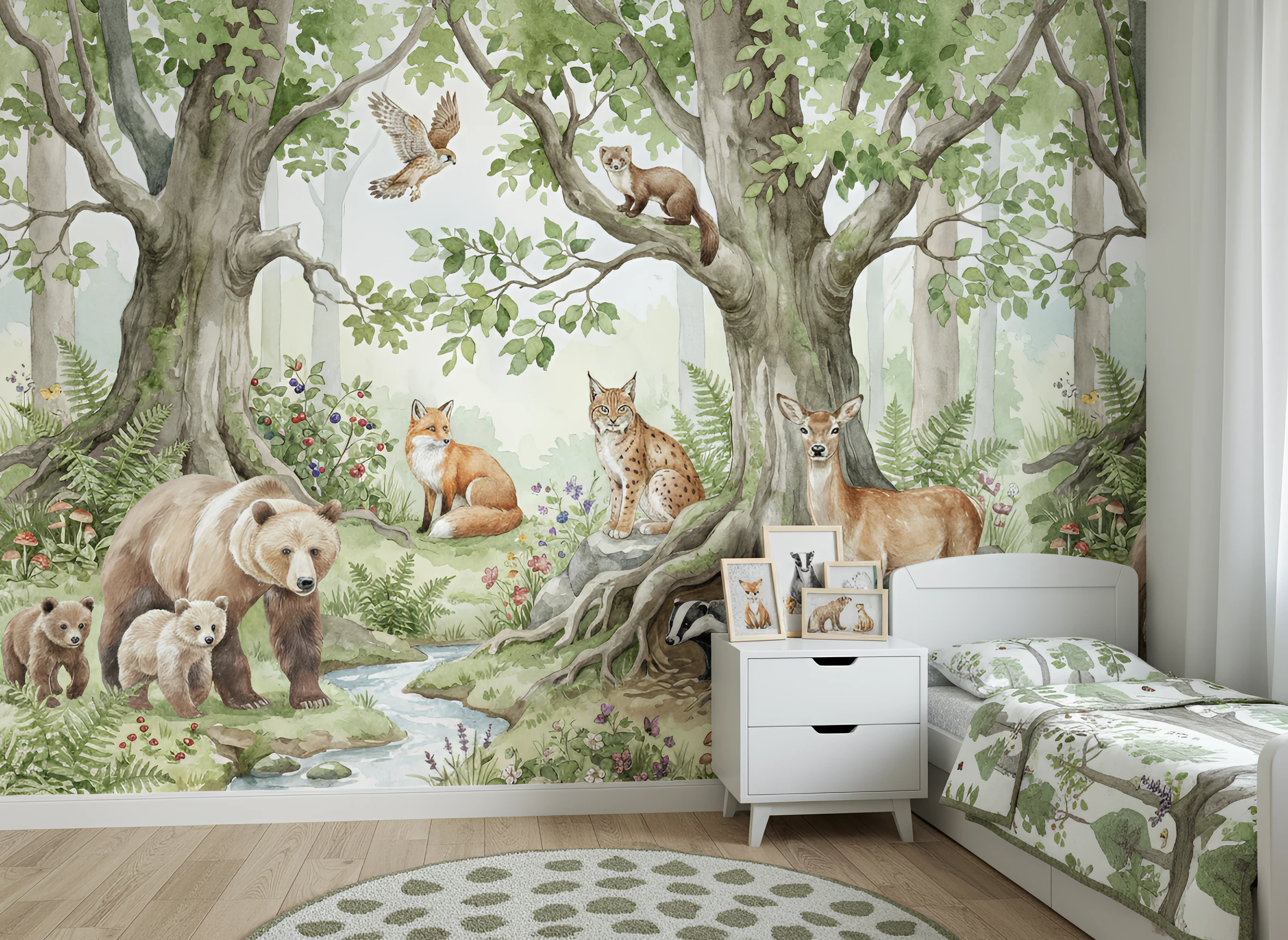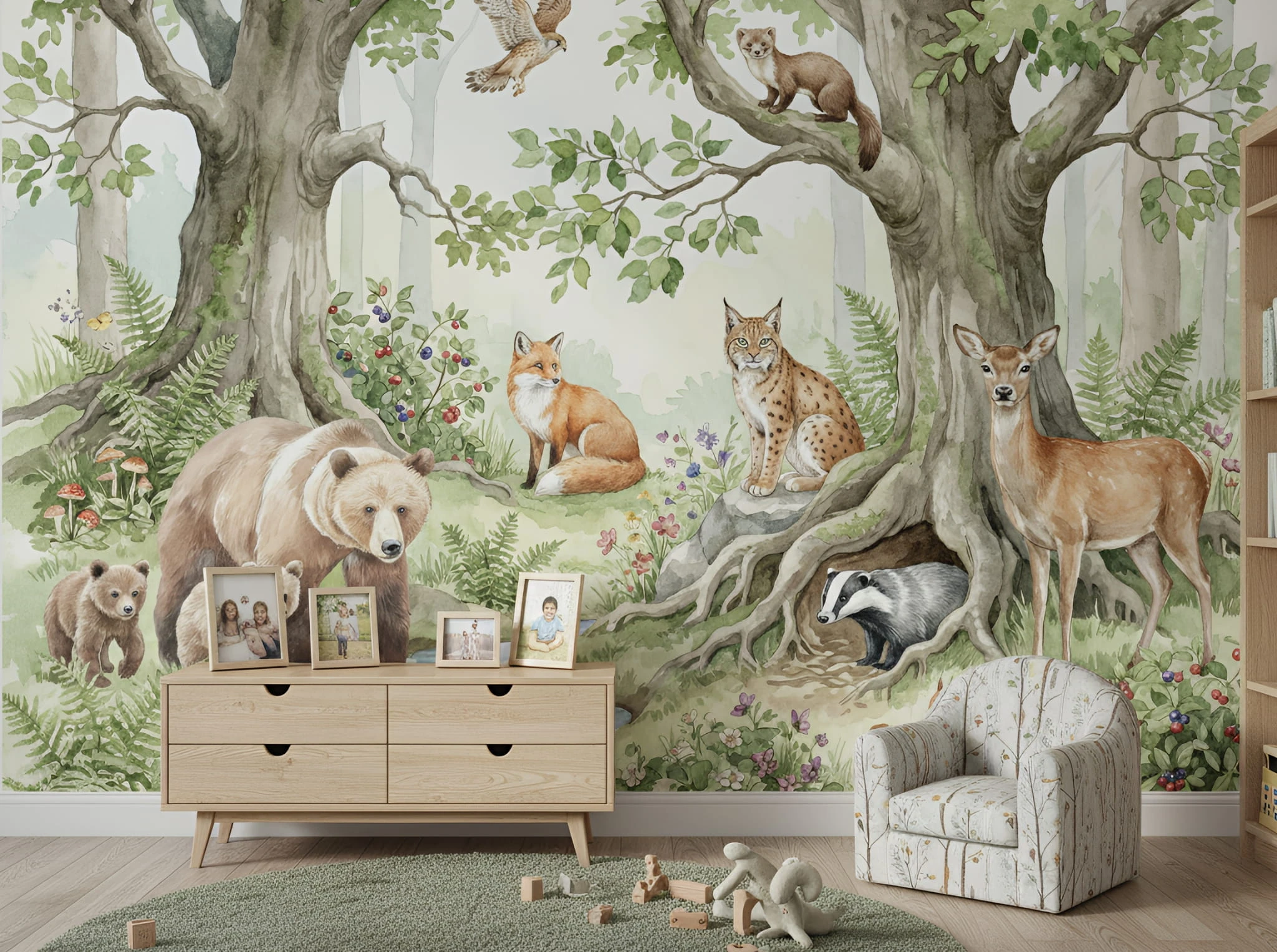 Fototapeta z motywem zwierząt leśnych — idealna jako dekoracja ścienna do pokoju dziecięcego. Wysokiej jakości materiał, łatwy montaż
