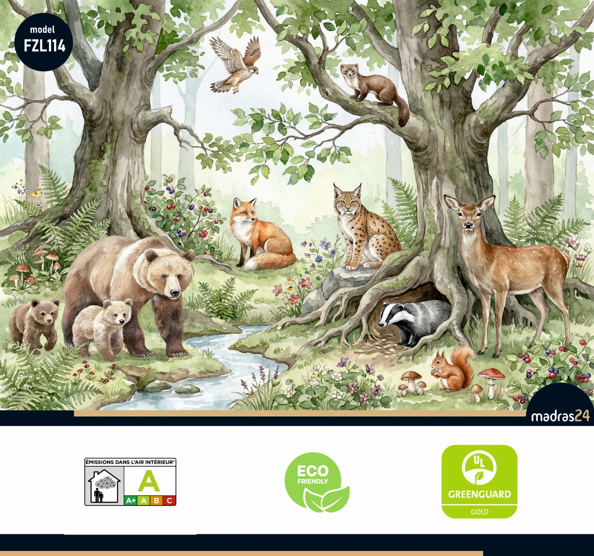 Przenieś pokój swojego malucha w sam środek baśniowego lasu! Nasza fototapeta to nie tylko dekoracja, to brama do świata wyobraźni, gdzie wśród kojącej zieleni drzew, nad brzegiem błękitnej rzeczki, mieszkają przyjaźni leśni bohaterowie.