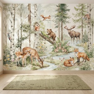 Fototapeta z motywem zwierząt leśnych — idealna jako dekoracja ścienna do pokoju dziecięcego. Wysokiej jakości materiał, łatwy montaż