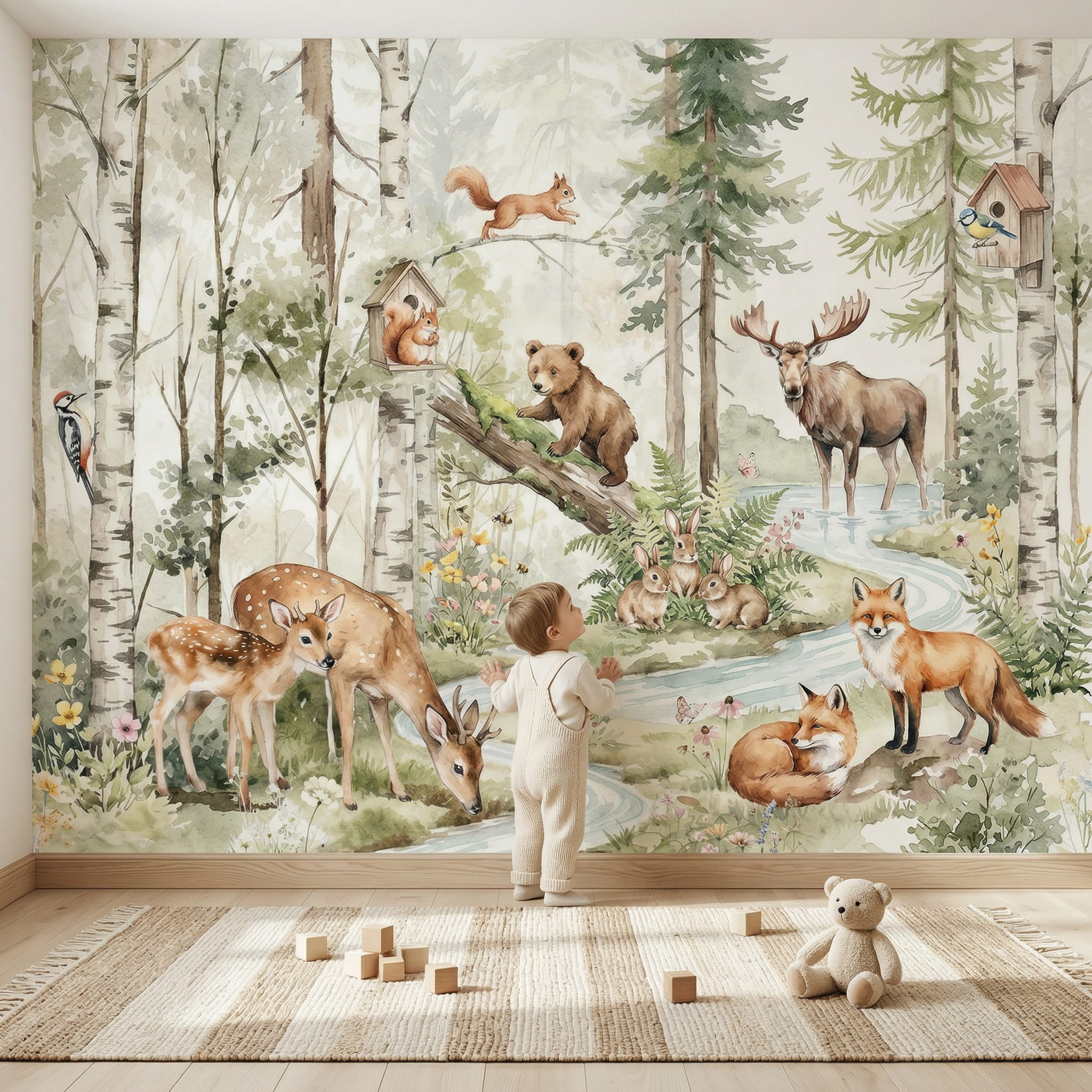 Przenieś pokój swojego malucha w sam środek baśniowego lasu! Nasza fototapeta to nie tylko dekoracja, to brama do świata wyobraźni, gdzie wśród kojącej zieleni drzew, nad brzegiem błękitnej rzeczki, mieszkają przyjaźni leśni bohaterowie.